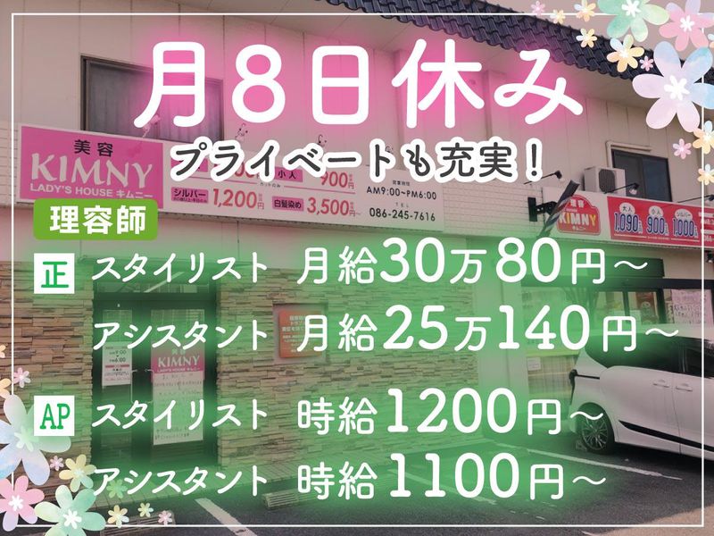 仕事内容 \ 理容・美容スタッフ募集 / 【✨働き方の自由度バツグン!】 ◎「平日のみ」「土日祝のみ」 「午後から」など柔軟対応! ◎ブランクOK!子育てや転職で 職場復帰を考えている方歓迎! ◎8:30~19:30の間で1日3時間~OK! 【✨お仕事の流れ】 まずは当店でのお仕事の 流れを覚えていただきます。 ゆっくりじっくり出来ることを 増やしていきます! それから、シャンプー・カット・顔剃り カラーなど全ての業務をお任せします! 直近で入社した方も元気に活躍中です♪ 【✨当社について】 理容室&美容室を併設運営! ・「技術を磨いて独立したい!」 ・「美容業界に復帰したい!」 ・「環境を変えてもう一度挑戦したい!」 そんな方を全力応援! 美容師から理容師に転身希望の方は "給与優遇" もいたします✨ 【✨あなたに合った働き方が可能!】 自分のスキルやライフスタイルに あった雇用が可能なキムニー! 理容師のスタイリスト・アシスタントなど、 スキルや希望に応じた働き方が選べます! ぜひ、お早めにご応募ください♪ 経験や・能力は面接時等に お聞きさせていただきます★ 【✨充実の研修制度あり】 月曜日の午前中を使い 全2回~8回の研修を行います! ※2回は必須の研修で、 3回目以降は能力により変動します。 あなたのスキルに合わせて研修を行うので 少しずつ当店のやり方や技術を学び、 安心して勤務していいただけます♪ この全8回の研修時は時給1000円支給★ 出来ることを増やして給与UPも!