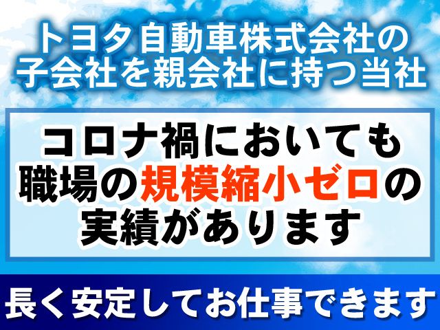 休日 土日休み(土曜日の出勤はトヨタカレンダーに準ずる) 年末年始休暇、夏期休暇、有給休暇 年間休日120日以上 <家族や友人との時間を大切にできる> 土日休み・大型連休があるから年間休日120日以上! 残業が多くても休みはしっかりとれる体制なので、 私生活を充実させたい方にピッタリ。 オンオフ切り替えて働きませんか?