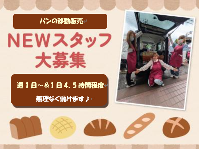 求めている人材 要普通免許 自家用車の持ち込みができる方 (軽自動車または小型車) 開始日応相談 未経験・バイト・パートデビュー大歓迎! 今いるスタッフも未経験から始めました◎ 主婦(夫)さん、フリーターさん歓迎 <こんな方にオススメ> ・人と話すのが好き ・地元で働きたい ・未経験からチャレンジしたい ・パンが好き!食べることが好き! ・子育てと両立しながら 無理なく働きたい ・短時間で働きたい ・Wワークで更なる収入アップを目指したい