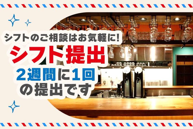 勤務時間詳細 【勤務募集時間】 09:00~23:30(シフト制) ・週2日~OK ・1日4時間~OK 【営業時間】 平日) ランチ 11:30~15:00 ディナー 17:00~23:30 土日祝)ディナー 16:00~23:00