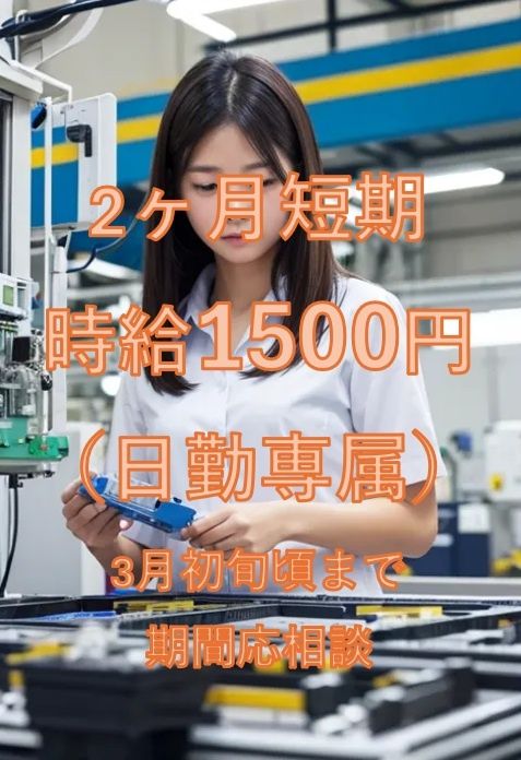 仕事内容 2ヵ月間の短期スタッフ募集!! アルバイトをお探しの方にもピッタリ! 職場環境は暑い寒いもなく、快適です。 日勤のみ・土日祝休み! 【お仕事について】 小さい家電製品の部品を手作業で 組み立てるお仕事です。 組み立てた製品の検査も行います。 難しい作業は一切ありません! 重量物は一切ありません! アルバイト感覚で気軽に働ける内容です! 【おススメポイント】 ・かんたん軽作業! ・2ヵ月間の短期! 就活中のつなぎとしてもOK! お休み中の学生さんもOK! ・製造系の業界未経験歓迎! ・短期のパート、アルバイトを お探しの方にピッタリ! 製造や工場などが未経験な方でも 比較的早く作業を覚えて、進める ことの出来る職場です。 工場見学も出来ますので、一度 作業現場を見ていただいてから 決めていただく事も可能です。