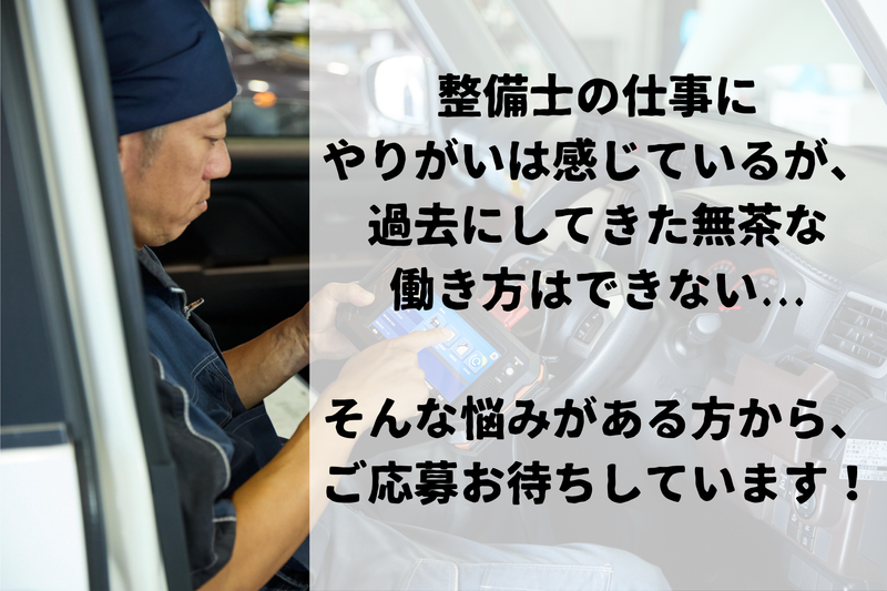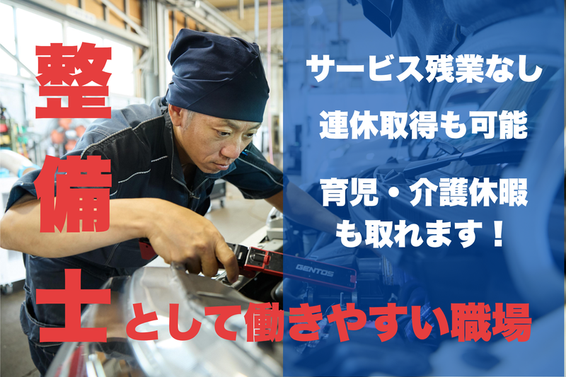 求めている人材 ================ ✅要普通免許 ✅自動車整備士資格(3級以上保有者) ================ \以下、当てはまる方は大歓迎!/ ⭐整備・自動車鈑金塗装経験者 ⭐認証整備工場、指定整備工場での勤務経験のある方 ・学歴不問、職歴不問 ・職種未経験歓迎、社会人未経験歓迎 ・社会人経験10年以上歓迎 ・業界未経験歓迎、ブランクOK ・シニア応援 ・第二新卒歓迎 アルバイト、パート、派遣社員、契約社員、 フリーターから正社員を目指すことができます。 ドライバー、営業、事務、飲食、工場勤務、 介護、現場作業員、建築土木、サービス業など、 全くの異業種からのチャレンジも大歓迎! ハローワークで仕事探し中の方も、ぜひご応募ください!