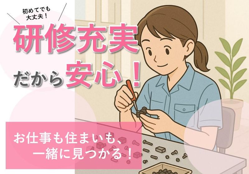 仕事内容 【座ってできる簡単モクモク作業!】 20代から30代の女性中心の職場環境になります。 キレイな職場&空調完備の快適な環境で、座りながら行う部品の組立や検査の作業です。 重たい物を扱うこともなく、力仕事は一切なし。 細かい作業が得意な方や、集中してモクモクと作業に取り組むのが好きな方にピッタリのお仕事です! 丁寧な研修もあるので、工場ははじめて・・・という未経験の方でも大丈夫。 自分のペースで出来るので、ライン作業が苦手・・・という方も安心です。 今まで接客のお仕事だったけど、人間関係が大変で・・・ という方でも大丈夫! コツコツモクモク、自分のペースで働けます! \寮費無料で新生活を応援!/ 一人暮らしを始めたいと思っている方必見! 「家族と同居だから羽根をのばせない・・・」 「隣町だけど、それでも寮に入れるのかな?」 「今の仕事はサービス業なので土日休めない・・・」 などなど。 ご相談ください! 初期費用無料、毎月の寮費も無料の注目案件。 生活費をグッと抑えて、オシャレや趣味、美容にもお金をかけられる♪ 寮は最寄りの大きな駅にあるので、生活にも困りません。 どんな寮か気になる方、グレードアップも相談可能です。例えば「独立洗面台が欲しい」「築浅物件が良いな」など ご要望をお伝えください。 土日祝休みに加え、年末年始・GW・夏季休暇もあり、年間休日はたっぷり126日、 日勤のみなので、オンとオフのメリハリをつけて長く働ける環境です。 仕事以外の時間は思いっきり楽しみたい、そんなあなたをお待ちしています。