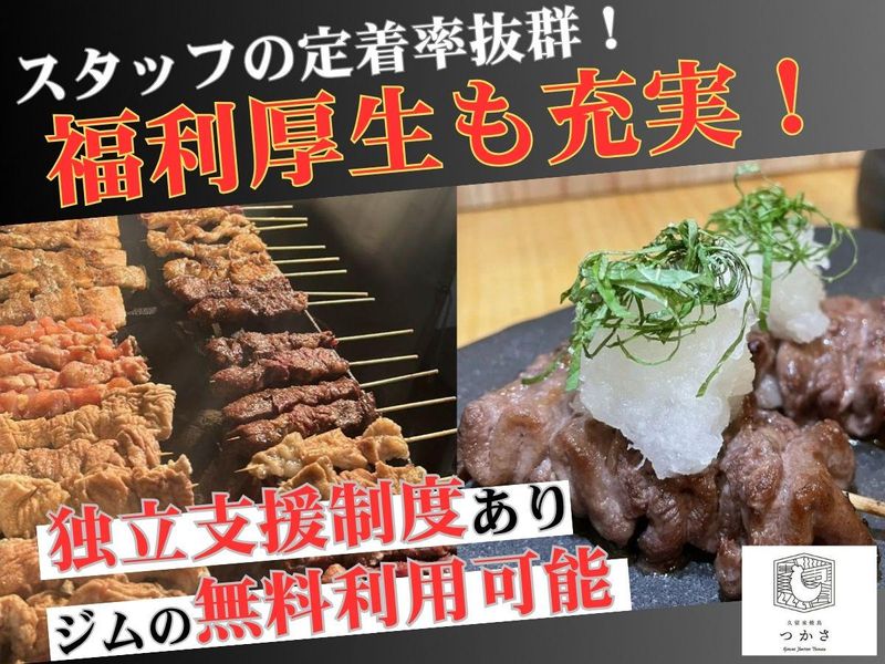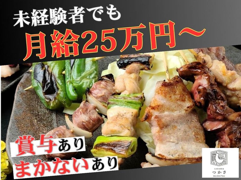 仕事内容 ✨久留米市内に新店舗OPEN予定✨ 《正社員》店舗運営スタッフ募集!  ̄ ̄V ̄ ̄ ̄ ̄ ̄ ̄ ̄ ̄ ̄ ̄ ̄ ̄ ̄ ̄ 新店舗の中核メンバーとして活躍できます! 未経験からでも、店舗運営に挑戦可能☆⁺⁺ 経験者はもちろん、将来店長を目指したい方も歓迎! 《✨アピールPOINT✨》==== ✅昇給・賞与ありでしっかり還元 ✅未経験でも月給25万円スタート ✅系列店の美容サロンで脱毛や 眉毛サロンのメニューが無料で受けられる◎ ✅トレーニングジム無料で利用可能! ✅独立支援制度ありで将来の選択肢も広がる ================ 【仕事内容】 焼鳥店の店舗運営スタッフ(店長候補)として、 ホール・調理・店舗運営全般をお任せします。 (具体的には…) ●焼鳥の仕込み・焼き業務 ●一品料理の調理・盛り付け ●開店・閉店作業・清掃 ●在庫管理 など ⏩まずは店舗業務の基本からスタートし、 慣れてきたらスタッフ育成や売上管理など、 店舗運営にも少しずつ関わっていただきます。 ⏩今回は、新店舗のオープニングスタッフの募集となります。 新店舗オープンまでの間は、既存店舗で勤務いただき、 実際の業務の流れやオペレーションを学んでいただきますので、 未経験の方でも安心してスタートできます。 ⏩飲食経験のある方は、これまでのスキルを活かし、 即戦力としてご活躍いただける環境です。 ━━・・・・―・・・・━━━━━ ❯❯❯ ここで働く魅力✨ ━━・・・・―・・・・━━━━━ ✅お店の味を楽しめるまかないあり 焼鳥店ならではのこだわりの味をまかないでご提供! 頑張った日の楽しみになる特典です。 ✅キャリアアップできる環境 既存店で経験を積みながら、 新店舗や店長などへステップアップ可能! 店舗運営にしっかり関われる環境です。 ✅独立も応援 「いつか自分のお店を持ちたい」そんな想いをサポート! 経験・ノウハウを活かして夢に近づけます。 ━━・・・・―・・・・━━━━━・・・・―・・・・━━ ❯❯❯ 久留米焼鳥 つかさについて✨ ━━・・・・―・・・・━━━━━・・・・―・・・・━━ 西鉄久留米駅スグの場所にある「久留米焼鳥つかさ」。 一本一本丁寧に焼き上げるこだわりの串を中心に、 常時100種類以上の豊富なメニューを提供しています。 店内は1~2階まで全て個室。 女子会や誕生日、歓送迎会、家族での食事など、 幅広いシーンでご利用いただいている人気店です。 仕事帰りのサラリーマンからカップル、友人同士、ご家族連れまで 多くのお客様に愛されるお店で、一緒に働いてみませんか?