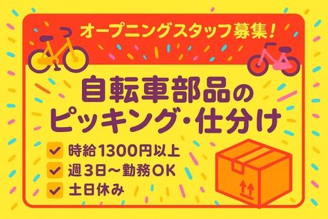 仕事内容 ◆大手自転車チェーンの物流センターでのお仕事 <お仕事内容> 物流センター内で、自転車に使用される 部品やアクセサリーのピッキング・仕分け作業 をお願いします。 具体的には… ・ハンディ端末を使って 部品のバーコードをスキャン ・棚から指定された部品を取り出して ピッキング ・大きさや種類ごとに分けて 仕分け作業 ・出荷前に内容を確認し、段ボールに 梱包・ラベル貼り ・取り扱うのは、自転車のタイヤ・ライト・ブレーキ部品など、比較的軽量なアイテムが中心です。 未経験でも安心!マニュアル完備で、最初は先輩スタッフがしっかりサポートします。 【おすすめポイント】 ◎新規事業所スタート! みんな一緒にスタートで安心♪ ◎時給1300円以上 → しっかり安定収入! ◎週3日~勤務OK → ライフスタイルに合わせて働けます! ◎私服勤務OK → 仕事帰りの買い物にも便利♪ ◎土日休み → プライベートも充実!