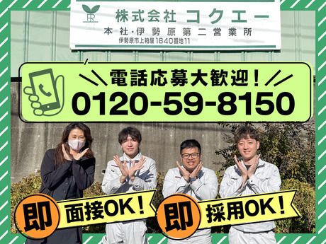 選考プロセス 【応募の流れ】 まずはご応募ください! 面接はWEBもしくは電話で行います ※ご不明点などはご相談ください 《営業所・寮所在地》 株式会社コクエー 伊勢原第二営業所 伊勢原市上粕屋1840-11 「伊勢原駅」「愛甲石田駅」より車15分 【問合せ先について】 問合せ先:0120-598-150 応募方法 【ご応募・お問い合わせ】 TEL:0120-59-8150(採用担当) WEBまたはお電話でご応募ください。 お電話でのご応募、大歓迎です!