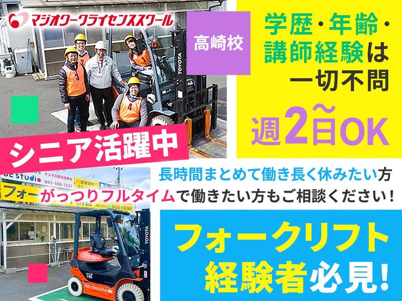 仕事内容 ◤ ̄ ̄ ̄ ̄ ̄ ̄ ̄ ̄ ̄ ̄ ̄ ̄ ̄ ̄◥ フォークリフト経験が活かせる 週2日~OK!フルタイム勤務◎ ◣______________◢ マジオワークライセンススクール高崎校 - 高度な技術力と豊富な実績を活かした講習で、 これまでに多くの方が免許を取得しています。 【業務内容】 『フォークリフトの講師』として フォークリフト免許取得を目指す方への 学科や実技の指導をお任せします! これまでの経験を活かして、 体験談や実践的なテクニックを伝えながら 受講生の成長をサポートできる やりがいのあるお仕事です。 >>講師未経験の方もOK! 「人に教えたことはない」 「実務経験が浅いから不安」 そんな方も問題ありません♪ 教育体制をしっかり整えているので、 未経験の方も安心してスタートできます! *…*…* \\ ココがポイント // ✨学歴・年齢は一切不問!講師未経験OK ✨長時間×がっつりフルタイムで安定性◎ ✨週2日~勤務OK!シフトは相談可能 ✨正社員登用制度あり◎長く活躍できる好環境 シニア世代も大活躍中! ぜひ、あなたの経験や技術を存分に活かして 講師としてご活躍ください!
