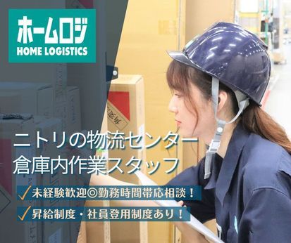 仕事内容 ニトリの物流倉庫で、ニトリの商品を取り扱う仕事です。 コツコツモクモク作業をされる方歓迎! 物流倉庫内で、商品のピッキング、仕分け、カゴ車搬入などの作業に従事していただきます。 未経験者でも大歓迎! ◆勤務シフトは柔軟に相談可◆ ニトリグループなのであんしん・安定の職場です。 その成長を支える物流会社です! さらに半年毎に昇給のチャンス!頑張るあなたの味方です! 勤務中は貸与される制服で作業可、もしくは私服 でも作業可(作業によって基準があります)。 ◆社員買物制度(社割)◆ 入社3ヶ月経過後より、ニトリの商品をお得に購入できる社員買物制度があります。気になるインテリアや雑貨などの商品を、お得に購入頂けます。ご自宅のコーディ ネートを考えながら仕事が出来るのも、ニトリグループならではのメリットの1つです。 ◆有給休暇取得率9割以上◆ ニトリグループの有休取得率は、90%以上! 有給休暇は勤務日数と時間により付与されます。 私たちは有給を最大限に活用して、プライベートと仕事にメリハリを作っています。 ◆健康診断◆ ニトリグループでは福利厚生の一環として、法定以上の定期健康診断を実施しております。健康保険組合に加入していない短時間勤務の方でも、学生アルバイトの方以外の長期契約であれば、どなたでも、自己負担無しで受診頂けます。