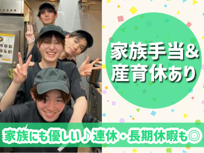 仕事内容 接客業務全般、アルバイトの育成・ 教育、調理・食材の仕入れ、 売上集計等の事務処理業務、 シフトコントロール等をお願いします♪ ⭐アルバイトさんたちとより良い関係を 築きながらお店の雰囲気を作って下さい ✅入社後の流れ  ̄ ̄V ̄ ̄ ̄ ̄ ̄ 配属された店舗でホールの掃除や 調理の仕込など、基本的なことから始めます。 その後は、メニューを覚えたり メニューの作り方を覚えるなど 実務を中心に学びます。 同時に、現場で接客を楽しみ、 お店の雰囲気づくりに貢献してください。 慣れてきたら仕入や発注、売上集計など、 店長のサポートをしていただきます。 ╭━━━━━━━╮ 将来のキャリアパス ╰━v━━━━━╯ まずは1店舗の店長職を経験 ⏩2~3店舗の店長として活躍 ⏩新規立ち上げ→SV→本部勤務 これはほんの一例ですが、 現場経験をSV職で発揮し、 新たな発見をし続けて現場と協力しながら より良い職場を作るという流れが一般的です。 SVの人数をもっと増やしたいと 思っていますので、 どんどん上を目指してください! ╭━━━━━━━╮ 当事業部の魅力 ╰━v━━━━━╯ ◆年間コンスタントに1~2店舗を新規出店⇒随時昇格のチャンスあり ◆早ければ半年、平均でも3年前後で店長へ!お給料ももちろんUP ◆残業は月10~20時間程度 ◆賞与はもちろん、家族手当や住宅手当なども充実! ◆飲食業界未経験のスタッフが多数活躍中です ◆「飲食の仕事って楽しそう!」という気持ちだけあれば大丈夫です ╭━━━━━━━╮ ここが注目! ╰━v━━━━━╯ いろいろなブランドとFC契約を結んで店舗運営をしているので、それぞれの仕組みや違ったやり方を学べます。ジョブローテーション(異動)をすることで一つの会社にいながら複数のブランドのノウハウを身に付けられます。 ★いろんな経験が活かせます!  ̄ ̄V ̄ ̄ ̄ ̄ ̄ ̄ ̄ ̄ ̄ ̄ ̄ 喫茶店、カフェ、居酒屋、レストラン、 ホテル、焼肉店、ラーメン店、パン屋、 和食、寿司、イタリアン、中華、洋食、 フレンチ等などの飲食店で ホールスタッフや調理補助、調理スタッフ、 キッチンスタッフなどの経験がある方や コンビニ、アパレル販売、ドラッグストア、 百貨店、スーパー、100円SHOP等の 接客経験がある方も大歓迎! 社員食堂の調理員や学校給食や保育園での 調理スタッフとして働いていた方も歓迎♪