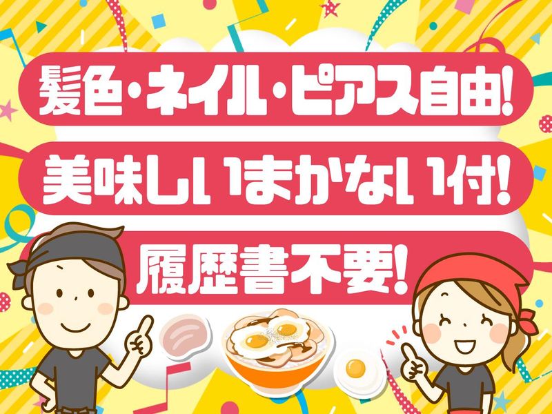仕事内容 / ✨今年12月中旬OPEN✨ チャーシューエッグ定食屋 スタッフ追加大募集(●"w"●) \ ▽ ▽ 予想よりお店が反響いただいているので、 この度スタッフを更に追加募集することになりました!!! 《ポイント》 ■髪色・ネイル・ピアス自由 ■「週1日~」「短時間OK」シフトの融通◎ ■学業・家事と両立◎ ■美味しいまかない付■履歴書不要 ■調理経験者優遇採用☆ ┌───────────── │ 仕事内容 └─▶チャーシューエッグ定食屋 ホール・キッチンスタッフ ✅土日祝入れる方、積極採用中!!!✅ 具体的には… ・お客様のご案内 ・料理・ドリンクの提供 ・レジ対応、片付け ・盛り付け等のカンタンな調理補助 など ◎オーダー取り基本ナシ◎ 店内はQRコードからのオーダーシステム。 なので基本的には注文取りはナシでOKです! ◎レジ=超簡単!◎ iPadに”会計ナンバーを入れるだけ”の超簡単システム! 機械触るのニガテ…そんな方も安心ですよ♪ ◎調理経験者(飲食店アルバイト経験者)大歓迎◎ 一緒にお店を盛り上げていきましょう♪ \飲食店経験がある方、大歓迎です/ ⭐正社員も募集中!!!⭐ ※詳細はお問い合わせください