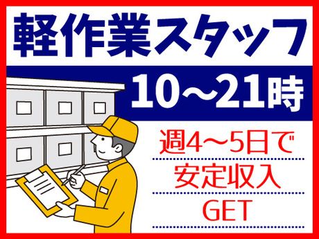 仕事内容 <特別な資格や経験は一切不要!玩具や文房具の仕分け・ピッキング> 軽作業スタッフ大募集! 「日勤のみ」だから生活リズムを整えやすい◎ シフトは週4日~応相談!ライフスタイルに合わせて働けます 先輩スタッフがしっかりサポートしますのでご安心ください! ★即日勤務可能な案件有! <こんな方にピッタリ!> 初めて倉庫で働いてみたい方 軽作業で無理なく働きたい方 安定して長く働きたい方