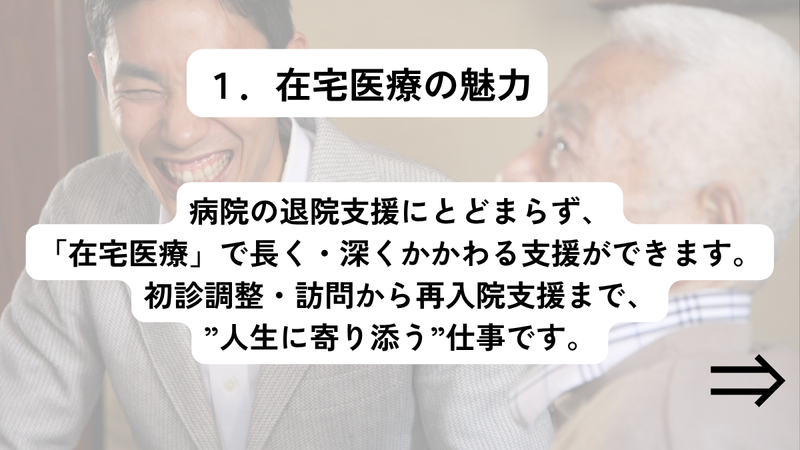 求めている人材 【必須資格】 普通自動車運転免許(AT可) ※ペーパードライバーの方はご相談ください 母国語が日本語でない方は、日本語能力試験(JLPT)N1合格者、または同等の日本語力を有する方。 ※患者さんやご家族との対話を大切にする仕事のため、医療の現場で円滑にコミュニケーションを取れる日本語力を重視しています。 \求める人物像/ ◎思いやりを持って患者様に向き合える方 ◎退院後の患者様のケアに関心がある方 ◎コミュニケーションを大切にできる方 ◎チームワークを大切にできる方 \こんな経験活かせます!/※必須ではありません ◎医療や福祉業界での経験がある方 \どんな人が活躍している?/ ◎元ケアマネージャー ◎前職は障害者施設勤務 ◎心理学部出身