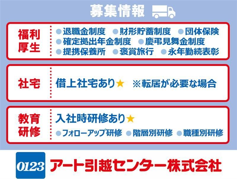 仕事内容 \\ 今の環境に、満足してる? //  ̄ ̄V ̄ ̄ ̄ ̄ ̄ ̄ ̄ ̄ ̄ ̄ ̄ ̄ ̄ ̄ ̄ ̄ 「今の会社、このままでいいのかな…」 「自分は、こんなもんじゃないはずだ…」 「やりがいも、休みも、給料も欲しい…」 「安定した会社で、再スタートしたい」 そんな想いを抱える 【第二新卒】のあなたへ。 その”モヤモヤ”は、”あなたの可能性”です アート引越センターで、 新しいキャリアをスタートしませんか? 創業50年!業界のリーディングカンパニー CMでおなじみ『0123』のアート引越センター 将来の不安なく、腰を据えて働けます。 その基盤があるからこそ、 社員の「働きやすさ」に本気です! \✨ 第二新卒も安心のポイント ✨/  ̄ ̄V ̄ ̄ ̄ ̄ ̄ ̄ ̄ ̄ ̄ ̄ ̄ ⭐100%反響営業のみ! 飛び込み・テレアポ・ノルマ一切なし! 「売る」のではなく「最適なご提案」を。 無理な新規開拓やノルマはありません。 ⭐未経験でも安心の研修制度 専用研修施設あり イチからプロのスキルを学べます。 ⭐『チームで戦う』面倒見の良い社風 困っている人を放置しない、 温かい社風です。 先輩・上司がしっかりあなたを育てます! ⭐頑張りが給与に直結! 平均月収36万円!インセンティブ充実! ⭐プライベートも超充実! 月8〜11日休み+有給取得(平均10日) 連休も取得OK! ⭐大手ならではの安定基盤 育休取得女性100%・男性42%、 借上社宅制度など 人生設計もバッチリです◎ ┏ ━━ ━━ ━━ ┓ ◆ お仕事内容 ◆ ┗ ━━ ━━ ━━ ┛ お客様の「人生の節目」である引越を サポートする営業(引っ越しプランナー)です。 【!】ここがポイント! ・100%反響営業です! ・飛び込みやテレアポは一切ありません。 ・個人ノルマもないので、お客様に じっくり向き合えます。 適性や希望に応じて配属します。 ▼ 個人営業 お問合せのあったお客様宅を訪問。 (1日5-6件程度) 引越日時や荷物の量、ご要望を伺い 最適なプランとお見積りをご提案します。 ▼ 法人営業 企業の「転勤」などを担当する部署へ 当社の引越サービスをご提案します。 既に取引のある企業様が中心です。 【勤務地】 ⭐各拠点で居住地・希望を考慮の上配属 ⭐U・Iターン歓迎!転勤なしも選べる ┏ ━━ ━━ ━━ ━━ ━━ ┓ ◆ 「大変そう」はもう古い! ◆ ┗ ━━ ━━ ━━ ━━ ━━ ┛ 引越業界のイメージを覆す 「働きやすさ」が自慢です! 〇 しっかり休める! ・月8〜11日休み(シフト制) ・年間休日114日 ・有給取得(平均10日以上!) ・連休OK!土日休みも相談可! 〇 しっかり稼げる! ・平均月収36万円! ・頑張りはインセンティブで正当に評価!