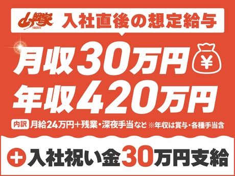 仕事内容 \ 最短1年で店長へ / 飲食経験者歓迎(ジャンル不問) *店長昇進後、「月給43万円」可! *飲食店経験者歓迎(ジャンル不問) *らーめん店の経験がなくても大歓迎! 業界屈指の安定基盤を誇る《丸千代山岡家》で、 「1~2年後に店長」を目指して働きませんか! <店長:月給43万円~> <ミドル店長:月給46万~60万円> ====================== 【30~40代から未経験で入社した社員も多数】 SNSやメディアで日々話題になる山岡家のラーメン。 ―でも、選ばれているのはラーメンだけではありません! 実は「働く場所」としても多くの人に支持され、 30~40代から未経験で入社した男性社員も多数活躍中! 現在は、西日本エリアで幅広く出店が加速中! 2026年も成長スピードはさらにアップします!! \ 四国初進出! / 4月3日、香川県に「高松中央インター店」がオープン予定! \ 博多区にも出店 / 4月22日、九州福岡に「福岡月隈店」がオープン予定! 福岡市内2店舗目、博多区初出店です!! ====================== 成長加速&エリア拡大中に伴い、 正社員を“積極採用中”!(2024年実績:180名以上) ★スムーズに業務を始めていただくために…★ 入社後は、茨城県つくば市にある自社の トレーニングセンターで研修を実施(3泊4日) ※研修中の交通費・宿泊費は全額会社負担! ※研修中もしっかり給与支給で安心スタート ====================== \ここがポイント/ 1)最短1年で「店長」へキャリアアップも可  ̄ ̄ ̄ ̄ ̄ ̄ ̄ ̄ ̄ ̄ ̄ ̄ ̄ ̄ ̄ ̄ ̄ ̄ ̄ ̄ ̄ 《昇進例》 ◆一般社員・・・・・【年収420万円/月給24万円】 ◆アドバンス社員・・【年収470万円/月給28万円】 ◆店長・・・・・・・【年収580万円/月給43万円】 頑張りがそのまま昇進に繋がるのが “山岡家”。 評価制度が明確で着実に仕事を覚えられるから、 未経験者も3年で店長になる社員が多数! ★経験者なら、よりスピード昇進が可能!! ★その後もエリアマネージャーや幹部候補、 本社スタッフ、スーパーバイザー(SV)など、 多彩なキャリアパスをご用意しています! 2)東証スタンダード上場企業の安定基盤  ̄ ̄ ̄ ̄ ̄ ̄ ̄ ̄ ̄ ̄ ̄ ̄ ̄ ̄ ̄ ̄ ̄ ̄ ̄ ◎今なら!入社祝い金30万円支給!! ◎残業代は1分単位で全額支給(みなし残業なし) ◎昇給・賞与は年2回!! ◎特別休暇を合わせて、実質年休111日! ◎有給平均取得日数7.5日(土日取得もOK!) ◎プライベートの都合に配慮したシフト希望休OK ◎女性だけでなく、男性社員の育休取得実績あり ◎20年以上活躍する社員も在籍する定着率の高さ ====================== 【お仕事について】 まずはホール業務からスタートします。 ゆくゆくは店長として、 アルバイト採用やスタッフ教育などの人材育成、 売上・利益率の管理、月次損益書の作成、 自店舗の目標達成に向けた運営戦略の立案・ 実行などをお任せしたいと考えています! <入社後の流れ> 最初はホール業務にて、 お店全体の流れや雰囲気をつかみます。 ▼ キッチン・洗い場・仕込みなども習得! 冊子のマニュアルや、店舗タブレットでも 視聴できる動画教材があるのでスムーズ! ▼ 店舗全体の流れを理解したら、 スタッフ育成や売上管理、発注業務など 店舗運営の中核を担うポジションへ。 ▼ 店長として、運営業務を一任します! ※接客・マニュアル・動画はすべて日本語です。 ※また、衛生記録なども日本語で記入します。 ・・・・・・・・・・・・・・・・・・・・・・ <店長インタビュー:30代・男性・ミドル店長> ・・・・・・・・・・・・・・・・・・・・・・ Q.【山岡家を選んだ決め手は?】  ̄ ̄ ̄ ̄ ̄ ̄ ̄ ̄ ̄ ̄ ̄ ̄ ̄ ̄ ̄ ̄ 店長に運営を任せるスタイルに魅力を感じました! セントラルキッチンを持たずに、 仕込みからすべて店舗で手作りしている 山岡家のラーメンが大好きだったことも理由です。 今では自分で判断できる領域が広くなり、 経験を積むほどお店づくりが面白くなっています! Q. 【店長としてのやりがいは?】  ̄ ̄ ̄ ̄ ̄ ̄ ̄ ̄ ̄ ̄ ̄ ̄ ̄ ̄ ̄ ̄ 人を育て、“強い店”をつくれることです! 特に新店の立ち上げはゼロから組み上げる分 大変ですが、その分やりがいが大きいですよ。 スタッフたちと積極的に関って、楽しく働けるよう コミュニケーションを取ることを心掛けているので、 スタッフが成長する姿を見ると、 店長としての自分の仕事にも誇りを感じます! <異動も “成長チャンス” として全力サポート> 週休2日制の正社員には全国転勤がありますが、 山岡家の異動は「経験の幅が広がる機会」として活用。 新しい環境で視野が広がることで、 評価につながりやすい仕組みになっています! <異動や転勤の際も安心の制度あり!> *全国への転勤費用・引越し費用は全額会社負担 *異動に伴う帰赴任手当なども全てサポート! 【丸千代山岡家について】 全国に190店舗以上のラーメン店を運営中。 売上好調!前年比平均10%以上の成長率! 47都道府県への出店を目指し、新店OPENも続々。 セントラルキッチンを設けず 全店直営&店内手作りにこだわる姿勢で、 根強いファンもたくさんいます! リピート率はなんと75%