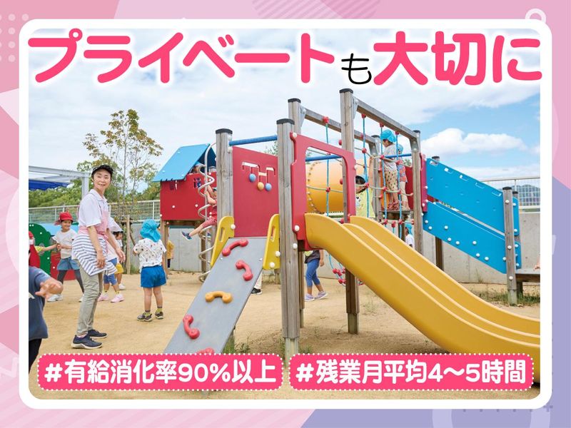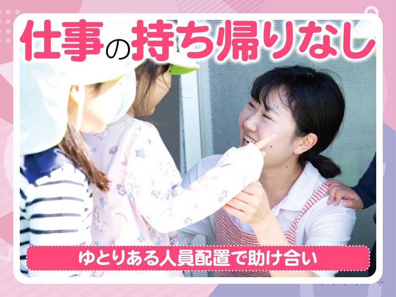 求めている人材 ●要保育士免許もしくは幼稚園教諭 ●実務経験不問 ●短大・専門卒以上 ●20代・30代・40代の女性活躍中 「結婚や子育てでブランクがある」 「資格は取ったけど実務未経験」 そんな方もぜひご応募ください! 当法人ではこれまで多くの新卒者を迎え入れており、 新人さんをサポートする体制がしっかり整っています。 - ■ママとして働く先生を応援 - 産休・育休から復帰して、子育てをしながら働く先生も多い当園。 周囲に遠慮する必要はありません。 3回育休を所得し復帰した3児のママさん保育士も活躍中です! 「子どもが急に熱を出した!」 「学校行事でこの日は休みたい…」 といった場合は、お互い融通し合って休みを回しています。
