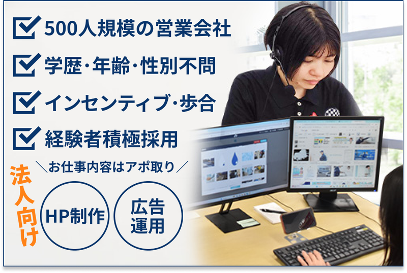【500人規模のしっかりした営業会社です。社員登用可、テレアポ経験者積極採用】名駅徒歩9分♪マニュアル、研修完備|学歴・年齢・性別関係なし。「独自のWEB広告サービス」を法人・事業者様にご紹介するアポインター大募集