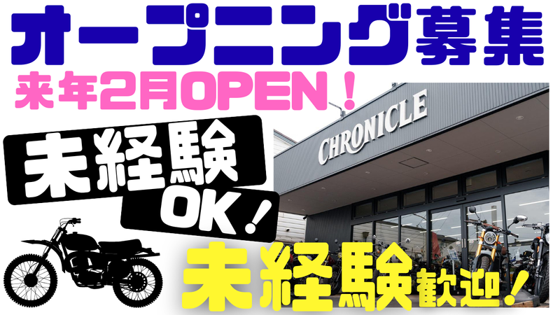 仕事内容 【オープニングスタッフ大募集*】 千葉県八千代市にROYAL ENFIELD 2026.2月新店舗をOPEN!! / 整備を通して一緒に会社を盛り上げ 業界を盛り上げましょう!! \ 二輪の整備や点検・修理などを行います。 ✅整備士資格なし・未経験からでもOK! ✅資格取得も可能です!! ◤ オープニングに伴い大量募集 ◢ ┈┈┈┈┈┈┈┈┈┈┈┈┈┈┈┈┈┈ ①応募 ②書類選考(履歴書送付) ③連絡 ④面接 ⑤合否通知(10日以内) 応募から採用までをスムーズに!! スピード採用を実施中です✨ *** ▮株式会社 クロニクル  ̄ ̄ ̄ ̄ ̄ ̄ ̄ ̄ ̄ ̄ ̄ 二輪車の販売、修理、サービス提供を行う、 "バイク屋”です。 ✨販売地域は日本全域 ✨取り扱うメーカーも外車や国産車と様々 「株式会社クロニクル」は 輸入バイクを中心に新車販売・中古車販売、 整備・修理を行っています。 整備のプロとして、知識と技術で お客様のバイクライフサポートしています。 *** 【◎ワクワクする気持ちを大切に】  ̄V ̄ ̄ ̄ ̄ ̄ ̄ ̄ ̄ ̄ ̄ ̄ ̄ ̄ ̄ ̄ ̄ お客様へのセールスやサービスは しっかりと行う一方、 休憩時間はオートバイ談議に花が咲いたり、 イベントなどでお客様と触れ合う際には スタッフも一緒に楽しむなど、 バイク好きには楽しい環境です♪♬ 【◎スタッフのための良い職場環境を】  ̄V ̄ ̄ ̄ ̄ ̄ ̄ ̄ ̄ ̄ ̄ ̄ ̄ ̄ ̄ ̄ ̄ 全従業員にとって良い職場環境を作り 会社を大きく成長させていきたいと 考えています。 「お客様のため・会社のため・仲間のため」 この3点をバランスよく考え、成長発展 させながら社会貢献活動できる会社を 目指しています! 【◎頑張りは給与で還元!】  ̄V ̄ ̄ ̄ ̄ ̄ ̄ ̄ ̄ ̄ ̄ ̄ ̄ ̄ ̄ ̄ ̄ 全従業員にとって良い職場環境を作り 当社では努力やプロセスなども評価し、 すぐに反映できる体制を作っているので、 頑張りはしっかり給与に反映します! 【◎ステップアップも応援!】  ̄V ̄ ̄ ̄ ̄ ̄ ̄ ̄ ̄ ̄ ̄ ̄ ̄ ̄ ̄ ̄ ̄ 整備、事務、営業とどの職種からでも マネージャーや役員といった役職を 目指すことができます。 将来的には整備業務に加え、納期の調整や スタッフへの指示・指導もお任せします。 〉業界を盛り上げたい! 〉スキルアップをしたい! 〉この業界で働き稼ぎたい! と熱い想いがある方、 一緒に面白い会社を作っていきましょう!