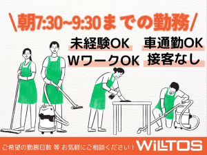インフォメーション 朝2時間だけのお仕事!扶養内勤務!朝活感覚で隙間時間にお仕事しませんか?未経験者活躍中! ☆週2日~ご勤務いただける方大募集!もちろん勤務日数はご相談ください! ☆未経験者活躍中 ☆大学生・専門学生OK ☆シニア・主婦(夫)さん活躍中 ☆扶養内勤務可 ☆Wワークにピッタリ ☆チームでのお仕事 ☆労災保険完備 ☆受動喫煙防止措置あり ~~~~~~~~~~~~~~~~~~ お電話でのご応募も受け付けています!お気軽に、まずはお電話ください♪ 応募受付TEL 0120-160-086 ~~~~~~~~~~~~~~~~~~ アピールポイント ☆未経験者活躍中 未経験から始めたスタッフが90%以上! 研修も充実しているので安心して始めていただけます! ☆大学生・専門学生OK 講義の前に勤務すれば 放課後の時間は自由に使えます! 朝サクッといかがですか? ☆シニア・主婦(夫)さん活躍中 朝のお仕事なので プライベートや家事の時間をたっぷりとれます♪ ☆扶養内勤務可 ☆Wワークにピッタリ 朝に仕事が終わるので そのあと別の仕事もできます! 弊社の他の現場もご紹介できますので お気軽にお問い合わせください♪ ☆チームでのお仕事 チームで分担して清掃を行っており リーダーや担当社員もいるので 安心して働けます! ☆労災保険完備 労災保険に入れるので万が一のことがあっても安心! ☆受動喫煙防止措置あり 請負のお仕事なので勤務地での喫煙は禁止です。 当社は創設40余年。パートナー社員の方を中心に約850名の方が働いています。 パートナー社員の方々に支えられ当社もここまでこれました。 これからもたくさんのパートナー社員の方々と共に、お客様の利用される空間をより清潔で快適な環境を提供し続けていきたいと思っております。 皆様も是非ウィルトスで一緒に働きませんか?