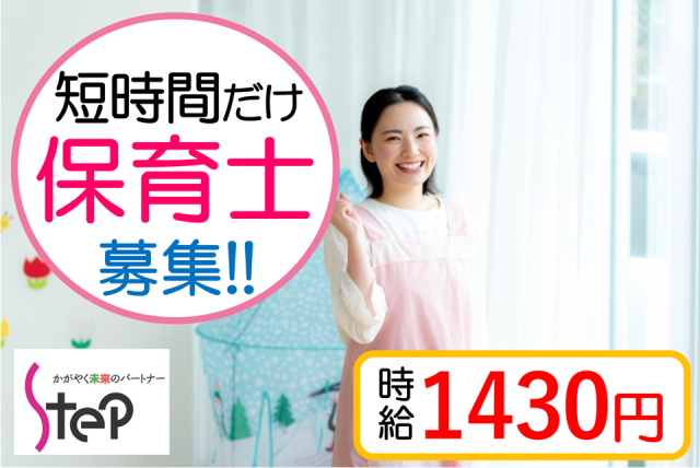 \月収目安7万円/ 1日2時間30分だけ☆ 土日祝休み♪ ピアノ弾かなくてOK! 保護者対応ナシ◎ 株式会社ステップグランドスタッフ 認可保育園の保育士 . ■案件NO,15598■お電話で案件番号をお伝えください! *:;;;:*:;;;:**:;;;:*:;;;:**:;;;:*:;;;:**:;;;:*:;;;:* 認可保育園の保育士の求人案件です♪ *:;;;:*:;;;:**:;;;:*:;;;:**:;;;:*:;;;:**:;;;:*:;;;:* \働きやすさ!/ ◆1日2時間30分のお仕事 ◆土日祝休み♪ ◆WワークOK ◆扶養内で働きたい方に パートのような働き方が叶います☆ 夕方の時間にゆとりがある方、 保育士さんとしてお仕事しませんか? 正職員さんのサポート業務なので 保護者対応や、ピアノ業務は ありません! _____________ 《こんな園さんです》 定員100名の認可保育園! 当社スタッフも多数活躍中で 働きやすさが自慢の園さんです☆ 広い園舎、広い園庭で のびのび保育をすることができますよ! _____________ \ステップのここが嬉しい/ 園への見学時も同行します☆ 働く上で園へ伝えておきたいこと、 時間の相談などなど ご自身では伝えにくいことも コーディネーターが伝えますので 見学時も安心です♪ 事前に園の雰囲気を知ってから 入職に繋げることができるのも 嬉しいポイント! 1人で悩まなくても大丈夫! 保育士としての経験がある コーディネーターが あなたのお仕事開始まで 精一杯サポートします! もちろん、お仕事開始後も 継続的にサポートしますので ご安心ください☆ ・・・・・・・・・・・・・・ \希望登録/も受付中! 希望の条件で働けるチャンス☆ 通勤時間や、勤務時間、勤務曜日など ご希望をお聞かせいただいた上で あなたにぴったりの園さんを ご提案させていただきます♪ .