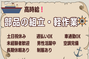 インフォメーション 時給1400円 資格不要 車通勤OK 未経験大活躍☆ 週払いOK 船舶部品を作っている会社で部品の組立のお仕事です☆ 未経験大活躍☆ 特別な資格は不要です! 丁重に教えます!安心してお任せ下さい。 土日祝休み 長期休暇あり サービス休憩あり お仕事しやすい環境で無理せずにお仕事できます。 アピールポイント アフターフォローもしっかり!! 不安な事、わからない事、どんな些細な事でも構いません。ご相談ください。 すべて担当者がフォロー致します。 私たちは働いて頂く方、一人ひとりを大切に、安心して働いて頂くために全力を尽くします! 自分力バロメータ 向上心 柔軟性