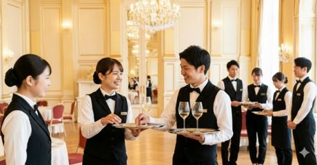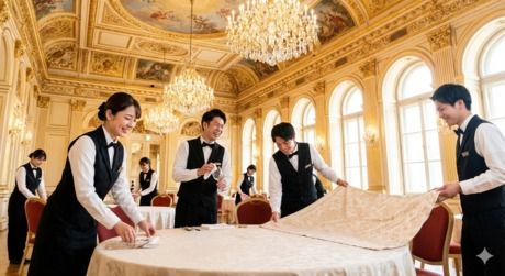 仕事内容 ホテルで宴会サービスのお仕事 「ワンランク上のパーティー」を支えるチームプレー! 中世ヨーロッパを思わせる華やかな会場で、イベントや披露宴の運営をサポートします。 会場のセッティング・準備: 居酒屋での「開店準備」のようなイメージです。 テーブルを並べ、お皿やカトラリーを美しく配置します。 準備物の運搬: 必要な備品を裏側から会場へ運び込みます。 チームで協力するので安心です! 料理のサーブ・下膳: お客様へお料理やドリンクを運び、空いたお皿を下げます。 ファミレス等での「配膳・バッシング」の経験がそのまま活かせます! 「レストラン経験がないけど大丈夫?」 もちろんです。専門的なマナーや所作は、研修でイチから丁寧にお教えします。 まずは「お客様に喜んでほしい」という気持ちがあれば十分です! この仕事で手に入る「一生モノ」 洗練された立ち振る舞い: どこへ出ても恥ずかしくない一流のマナーが自然と身につきます。 最高のチームワーク: 1つのイベントをみんなで作り上げる達成感は格別。 同年代の仲間も多く、すぐに馴染める環境です。 感動の瞬間: 新郎新婦の門出や、企業の祝賀会。 誰かの人生の節目に立ち会える、やりがいに満ちた仕事です。
