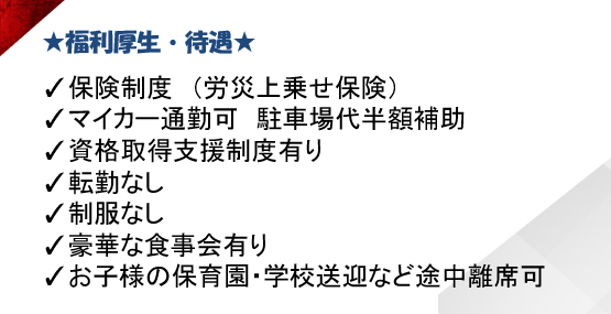 職場環境 従業員数:6名 フランクな雰囲気の職場です。 研修などのサポート体制も抜群! 久しぶりに働く方でもしっかりフォローします◎ 引継契約もあるので心配なくスタートできますよ! 喫煙所:なし(敷地内全て禁煙) 敷地内・社用車禁煙