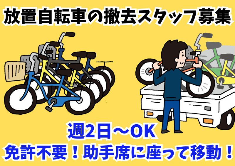 仕事内容 4月スタート!放置自転車撤去オープニングスタッフ募集★ 「街を快適にするサポート役」 を担う、地域貢献度の高いお仕事です! 【お仕事内容詳細】 ・放置自転車をトラックで回収・保管所まで運搬します。 ・自転車に警告札を貼る。 ・場所の確認や記録用にスマホで撮影。 ・現地までトラック移動(助手席に乗るだけ!)*運転免許は不要です。 必要な作業をシンプルにこなしていくだけ♪ 「誰でも始めやすい!」 と好評のお仕事です。 【お仕事のポイント★】 ① 簡単&シンプルな作業 トラックで移動して自転車を積み込み、保管所へ運ぶだけ! スマホで撮影・自転車に札を貼るお仕事もお任せします! 運転免許は不要!身体を動かしつつ働きたい方にもぴったり。 ② 未経験でも安心スタート◎ スタッフの 9割以上が未経験スタート! 法定研修が充実(21時間分+食事手当支給!)。 50代・60代の方も多数活躍中♪「同世代が多く安心した!」という声が多数あります。 ③ 厚待遇で安心! 日給保証あり!早上がりの日も日給全額支給♪ 入社祝い金&研修手当で最大【8万円】支給! 日給10,500円~ + ¥交通費全額支給で安定収入¥ 週払いスタート可能。スグにお給料が欲しい方も安心♪ (週4以上は+1,000円ベースUP♪ 11,500円~) ④ 働きやすい柔軟シフト♪ 週2日~OK!ライフスタイルに合わせて無理なく働けます。 日勤中心なので夜勤なし!生活リズムを崩さない働き方が可能です◎ その他都内各地にもお仕事あり! 当社では警備のお仕事未経験からスタートしたスタッフが約8割なので、研修制度も充実しています! 特別な知識や経験は不要ですので、まずはお気軽にご応募ください♪