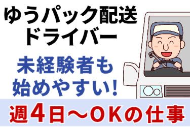 仕事内容 <急募>ゆうパック配達ドライバー \働きやすさが魅力!未経験歓迎/ 郵便局の仕事で安定しています。 【働き方】 日数/週4日~OK 時間/7:30〜終業まで 日中のみで夜間や深夜ナシ! 日数や時間の相談OK! ゆとりの週休3日制です。 週5日や6日で働きたい方は大歓迎! 黒ナンバーの車両を持込める方は 週2日~働けます! 【長期で安定】 ゆうパックの配送と集荷を行います。 必須資格/AT限定の普通免許でOK 運転車両/軽自動車での配送 勤務地/所沢郵便局・直行直帰OK 配送エリア/所沢市内 報酬/完全出来高制 配達件数のノルマはありません! 【安心のポイント】 同乗研修あり 荷物の積み方、配達方法、お客様への 接し方など、丁寧にお教えするので、 未経験の方も安心です。 加盟金・月会費なし 研修後は1人でマイペースにお仕事 エリアに慣れると、効率も収入もUP! 月収18万円~25万円以上も可能です。 週払い(翌週水曜払い)もOK! リース車もあり!! 車がない方はリース車貸出も 可能なのでご相談ください。 【未経験歓迎】 「運転好き」「業務委託が初めて」 「ハローワークで仕事を検索中」 という方も歓迎です。 未経験者も希望収入が得られるよう バックアップします。 【経験者大歓迎】 黒ナンバー・軽バン所有者や 車の持ち込みができる方は大歓迎! 上記が両方ある方は週2日~OKで、 Wワークも可能。 軽貨物・ルート配送、軽トラ・中型・ 4tトラック運転手、運輸・運送会社 などのドライバー経験を活かせます。 正社員・アルバイト・パート、短期・ 単発での経験者も歓迎! 仕事にブランクがある方もOKです。 【幅広い年代の男女活躍中】 若手の30代から60代の方が活躍中! フリーターから主婦(夫)、ミドル世代、 中高年、シニアの方まで幅広い年代の スタッフが在籍しています。 まずはお気軽にご連絡ください。 不明な点や疑問点などの質問も歓迎です。 <お電話はコチラ> TEL/070-4005-0780 受付/9時~20時