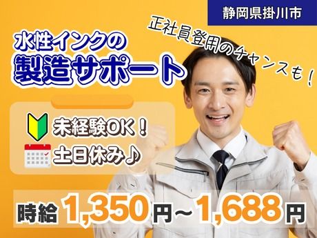 仕事内容 【仕事内容】 《アピールポイント》 ・未経験可 ・20~30代活躍中 ・日勤、平日のみ ・昇給制度あり(1年後時給+100円、年収約20万円UP) ・正社員登用あり ・日払い(前借り)可能!※規定有 《電話応募》 053-489-6001 までお問い合わせください。 《お仕事データ》 作業の難しさ:★★☆☆☆ 1日の運動量:★★★★☆ 1日体感時間:★☆☆☆☆ 昇給のし易さ:★★★★★ - 有機赤色顔料の専門メーカーで様々な色を作るベースの製造工場です。 水性インクの製造サポートをお願いします。 材料の配合、機械投入、運搬が主な業務となります。(重量は10~20kgほど) インクと聞くと臭いが気になるかと思いますが、水性インクを主に扱う工場の為、臭いはキツクありません。 未経験でも問題なく、将来的に正社員登用の可能性もあります。 ※フォークリフト資格・経験者歓迎(所有していなくても問題ありません) - 【月収例】222,000円+交通費規定支給 (時給1,350円、1日7.25時間 、残業10時間の場合) *未経験OK *正社員登用可能性あり *社会保険即日加入OK *フルタイム勤務 *評価、昇給制度あり *退職金制度あり