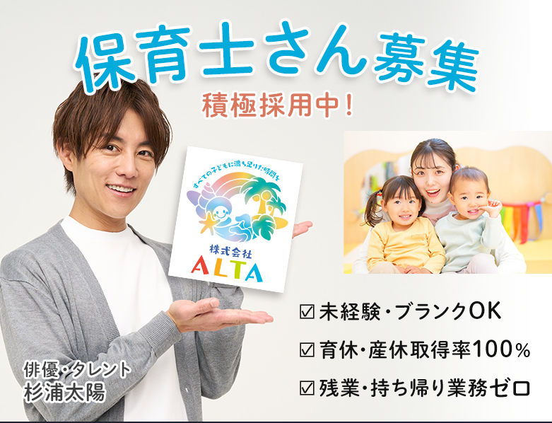 仕事内容 ✅残業ほぼ0、持ち帰り業務0! ✅産休・育休の取得率は「100%」 ✅ICTシステムで業務の効率化実現 ✅保育システム×明確な評価基準 ✅賞与年3回!昇給年1回で収入◎ ✅地域No.1のグループ連携力で安心 ☆.。.:*・゜☆.。.:*・゜☆.。.:*・゜☆ ⭐株式会社ALTAが展開する保育事業  ̄ ̄ ̄ ̄ ̄ ̄ ̄ ̄ ̄ ̄ ̄ ̄ ̄ ̄ ̄ ̄ ̄ 保育士養成機関の元教員である 現代表によって創設されました。 今では埼玉・千葉エリアに 計30施設もの認可保育園と 小規模保育事業所を運営しています✨ 数多の保育学生の成長を 見届けてきたその実績をもとに "保育士一人ひとりの成長"に焦点を充て 学び合いの文化を醸成してきました。 働く保育士が自分自身の成長を実感し 自由な環境でのびのびと働ける――。 組織としてその風土をつくりあげ さまざまな待遇・福利厚生により キャリアの実現をサポートしています。 ☆.。.:*・゜☆.。.:*・゜☆.。.:*・゜☆ ⭐とにかく福利厚生が手厚いです!  ̄ ̄ ̄ ̄ ̄ ̄ ̄ ̄ ̄ ̄ ̄ ̄ ̄ ̄ ̄ ̄ ■賞与年3回&昇給年1回 └頑張りはカタチで還ってきます! ■残業はほぼ0(ゼロ) └さらに持ち帰りの発生はナシ! ■AI分野への取り組みも充実! └LOVOTを導入する小尾で 保育士も子ども達も笑顔に♬ ■ICTシステムによる効率化 └事務仕事はサクサクできます! 子どもたちと向き合う時間がとれます! ■有給消化率は100% └有給休暇はスタッフの権利です! 遠慮せずに取得しましょう! ■年間行事数は1~2回と少ない └行事の準備で時間は取らせません! ☆.。.:*・゜☆.。.:*・゜☆.。.:*・゜☆ ⭐仕事内容  ̄ ̄ ̄ ̄ ̄ ̄ アルタキッズ妙典園では 生後57日~5歳までの児童が対象です。 定員は75名となっております。 ◎年齢・発達に応じた保育 (食事・排泄・午睡・遊び等) ◎健康状態や情緒の観察 ◎安全管理・見守り ◎登園・降園じの対応 ◎保育参観の実施 ◎イベントの準備(年1~2回程) ◎園内の衛生管理と美化 ◎食育・五感教育のサポート ☆.。.:*・゜☆.。.:*・゜☆.。.:*・゜☆ ⭐ご応募いただきたい方(人物像)  ̄ ̄ ̄ ̄ ̄ ̄ ̄ ̄ ̄ ̄ ̄ ̄ ̄ ̄ ̄ ̄ ⏩やりがい搾取にならずに、 収入とメリハリの両立を叶えられる 職場環境をお探しの方! ⏩園全体でデジタル化を進めており 効率よく日々の業務をこなしたい方 ⏩自分の時間もしっかり取りたい方 ⏩頑張りが正当評価されることで 明確なキャリア形成を図りたい方 ⏩産休育休を経ても 再び職場復帰をしたいとお考えの方 などなど…一つでも多く当てはまる方、 ぜひ当園へご応募くださいね✨ ☆.。.:*・゜☆.。.:*・゜☆.。.:*・゜☆