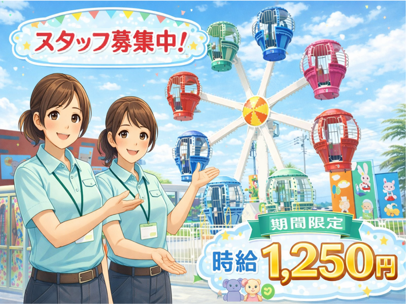 仕事内容 4/29~5/6のゴールデンウィーク期間限定! テーマパーク内の遊具運営のお仕事です。 <具体的には> ・遊具の案内、誘導 ・乗り降りのサポート ・利用ルールの説明 ・簡単な点検や清掃 など 難しい作業はなく、マニュアルに沿った対応が中心です。 未経験の方でも安心してスタートできます。 非日常の空間で楽しく働けるお仕事です。 ■事前にご確認ください ・立ち作業が中心となります ・屋外業務の場合、天候の影響を受けることがあります ・繁忙期は来場者が多くなりますが、シンプルな業務内容で未経験の方も安心です 【登録に関して】 ①ご応募を頂きましたら当社にて ご登録をして頂きます。 登録は履歴書不要となり最短で 当日でも可能となります。 ②当社には5カ所の登録会場が ございますので、最寄りの登録会場を ご案内致します。 ③ご応募を頂いたお仕事の ご案内をさせて頂きます。 ④当社担当コーディネーターと 一緒に職場見学をして頂きます。 ⑤職場見学を行い就業が決まります。 ⑥勤務当日は担当コーディネーターが 一緒に出勤を致します。 入社後も不安やお悩みがあれば お気軽にご相談ください。 【特徴】 当社は1990年に創業以降、 群馬県・埼玉県を中心に 人と企業のパートナーとして お仕事紹介の架け橋を行っております。 製造系、事務系、接客系等々、 様々なお仕事紹介をしており、 今後も『ありがとう』を派遣する企業で ありたいと思っております。 ご紹介をさせて頂いているお仕事は 常時約200件となり、若年層の方から 中高年やシニア層(40代、50代、60代) の方、またスキマ時間を利用して アルバイト・パートのお仕事をお探しの 主婦・主夫の方等、幅広く活躍をしております。