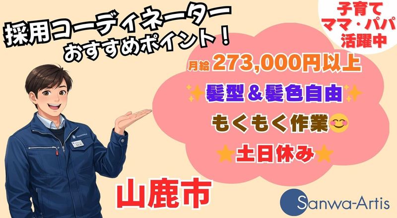 仕事内容 あなたのライフスタイルにあわせた お仕事みつけませんか? 【求人コーディネーターよりご挨拶】  ̄ ̄V ̄ ̄ ̄ ̄ ̄ ̄ ̄ ̄ ̄ ̄ ̄ ̄ ̄ ̄ ̄ ̄ サンワの求人をご覧いただき、 ありがとうございます。 私たち派遣事業部では 『共に学び、共に生長する』 という企業理念のもと すべての方により添うことを 大切にしています。 本日は最後までみていただけると うれしいです。 【採用コーディネーターより】  ̄ ̄V ̄ ̄ ̄ ̄ ̄ ̄ ̄ ̄ ̄ ̄ ̄ ̄ ̄ ̄ ̄ ̄ ✨月収27万3000円! ※深夜時給はなんと1625円!! ✨「カンタン」&「モクモク」軽作業♪ ✨未経験者さん大歓迎(*'▽') ✨自分らしさ全開でOK! 髪型・髪色自由♪ 製造業や工場が未経験の方も大歓迎! 【お仕事内容】  ̄ ̄V ̄ ̄ ̄ ̄ ̄ ̄ ̄ ̄ ̄ ̄ ̄ ̄ ̄ ̄ ̄ ̄ 手の平サイズの小さな部品を 工具を使い、図面やマニュアルを見て 組立・調整・検査などを行います。 ✅組立 └ドライバーを使用してのネジ締め ✅調整 └顕微鏡を使用してチェック 機械を使用しての動作確認 ✅検査 └細かい傷や汚れを目視でチェック! ✅梱包 └検査が終わった製品を丁寧に箱詰め 上記工程で完了! ※いずれも立ち作業になります 資格はいりません(*'▽'*) 【「覚えやすさ」が自慢!】  ̄ ̄V ̄ ̄ ̄ ̄ ̄ ̄ ̄ ̄ ̄ ̄ ̄ ̄ ̄ ̄ ̄ ̄ 業界未経験者さんでも始めやすい! 作業はシンプルで、 複雑な工程はありません。 入社後には丁寧な教育期間があるため、 工場ワークが初めての方も安心スタート! 【アピールポイント】  ̄ ̄V ̄ ̄ ̄ ̄ ̄ ̄ ̄ ̄ ̄ ̄ ̄ ̄ ̄ ̄ ̄ ̄ ✨研修制度が充実 安心して働ける環境です。 ✨業績好調の安定企業 長く腰を据えて働きたい方にぴったりの 将来性ある職場です。 【こんな方におすすめ】  ̄ ̄V ̄ ̄ ̄ ̄ ̄ ̄ ̄ ̄ ̄ ̄ ̄ ̄ ̄ ̄ ̄ ̄ ✨オシャレを我慢したくない方 髪型・髪色自由(金髪もOK!) ✨土日はしっかり休みたい方 長期休暇もあり、 オンとオフの切り替えがバッチリです。 ✨20代~40代が活躍する職場で、 仲間と一緒に楽しく働きたい方。 【職場見学・選考フロー】  ̄ ̄V ̄ ̄ ̄ ̄ ̄ ̄ ̄ ̄ ̄ ̄ ̄ ̄ ̄ ̄ ̄ ̄ ✨職場見学できます(予約制)! 「実際の作業の様子は?」 「休憩室の雰囲気は?」など 気になる点は事前にチェックして 納得してから決められます。 ご応募・お問い合わせ (オンライン面談も随時受付中!) ↓ 詳細案内・お仕事相談 ↓ 職場見学 (スタッフが同行して丁寧にご案内します) ↓ 内定・お仕事スタート!