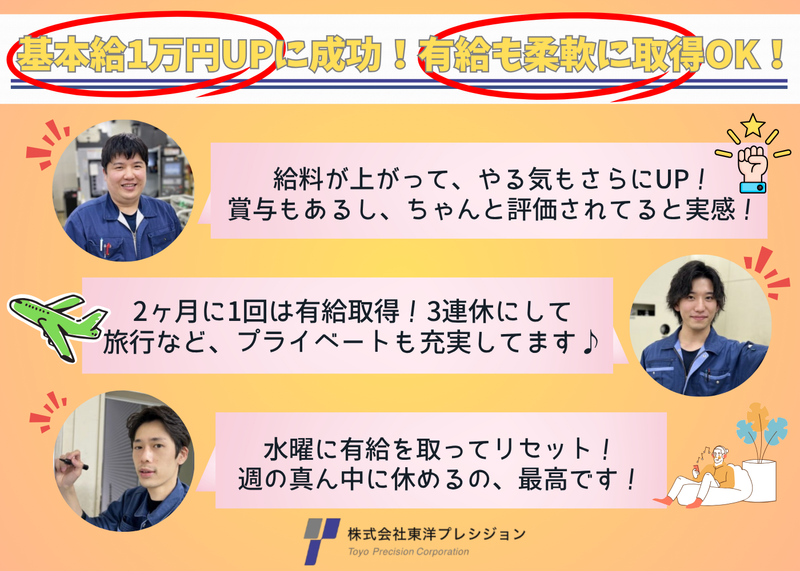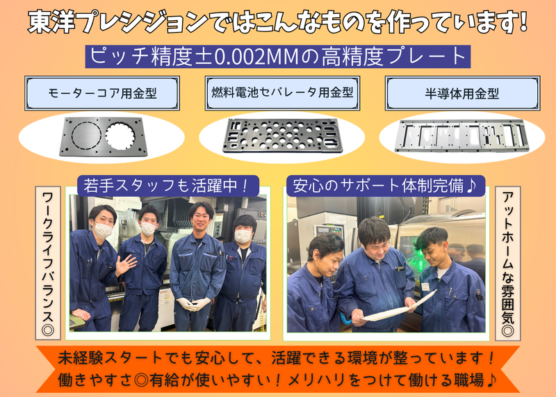 仕事内容 ✨【社員のリアル、動画で公開中!】✨ \SNSを事前にチェック!@toyo.pre/ 社員インタビュー動画随時発信中!!⏰ 会社の雰囲気など事前に覗いてみてくださいね♪ 高精度プレートを生み出す東洋プレシジョンで、【製造スタッフ】を募集! 「ものづくりに興味がある」 「業界未経験から手に職を付けたい」 「雰囲気の良い環境で働きたい」 そんなあなたにピッタリな職場です✨ 【✅東洋プレシジョンで働く魅力】 ⏫有給が使いやすい職場!ワークライフバランス◎ 「推しのLIVE参戦♪」 「水曜にお休み入れて週の真ん中でリセット♪」 「3連休を作って旅行♪」など、 仕事とプライベートにメリハリをつけられる環境です✨ ⏫充実の福利厚生&手当◎ 賞与4〜5ヶ月分支給!昇給も年1回! 頑張りをしっかり還元!高収入目指せる環境なのでモチベーション維持できます✨ ⏫安心のサポート体制!業界未経験大歓迎◎ 特別な資格や知識は必要ありません! 入社後は新人研修とOJTを通じて、世界に誇れる精密加工技術をしっかり学べます✨ ⏫若手スタッフも活躍中◎ 幅広い年齢層のスタッフが活躍中!長く安定して働ける環境が整っています✨ 20代:14名/30代:14名/40代:5名/50代:6名 ※パート・実習生含む 【✅仕事内容】 精密金型製品の製造業務全般をお任せします! 半導体用・コネクタ用・モーターコア用などの金型プレートを、工作機械を使って加工作業し、検査、出荷まで行います。 繊細な作業や高精度な加工が求められるお仕事です! ≪1日のスケジュール例≫ ▼8:00 出社 ▼8:05 体操&掃除 ▼8:30 製品の研磨開始(1日約10製品) ▼12:00 昼休憩 ▼13:00 中仕上げや後検定など最終確認 ▼15:30 焼き上がった製品の確認と砥石の準備 ▼17:00 終業&退社 未経験スタートの先輩も多いので、年齢問わず、安心して挑戦できる! わからないことも気軽に聞ける職場です♪ 【✅働く社員インタビュー】 ⏰新入社社員・Kさんインタビュー! Q:入社のきっかけは? A:地元・田川市で12年間、たばこのフィルター工場に勤めていました。 でも工場が閉鎖になり、県外への異動か退職かの選択を迫られました。 ちょうどその頃、娘が生まれて、出張や休日出勤の多い働き方を見直したくなったんです。 東洋プレシジョンは「休みがしっかり取れる」ことが魅力で、家庭と両立しながら働けると思い、入社を決めました。 Q:未経験でも不安はありませんでしたか? A:金型の製造は全くの未経験だったので、最初は不安もありました。 ですが、入社後には、先輩と半日一緒に作業する研修もあり、すぐに現場に慣れることができました。 先輩たちがとても丁寧に教えてくれて、わからないこともすぐに聞ける環境なので毎日安心でした! 作業中も気軽に声をかけながらコミュニケーションが取れるので、3ヶ月でしっかり馴染むことができました! Q:現在の仕事内容と、やりがいを感じる瞬間について教えてください。 A:現在は「研磨」を担当しており、図面通りにプレートを削っていく工程を行っています。 精度が求められる作業なので難しさもありますが、その分やりがいも大きいです。 1日に4〜5枚ほど仕上げますが、図面通りにぴったり仕上がった瞬間には大きな達成感があります。 細かな調整がうまくいったときは特に嬉しく、元々ものづくりが好きな自分にはとても合っている仕事だと感じています。 Q:逆に、大変なことは? A:今はまだ入社3ヶ月で大きな大変さはないですが、忙しい時期は業務が増えて大変になると聞いています。 でも、それだけ仕事があるのはありがたいことだと思います。 Q:職場の雰囲気はどうですか? A:作業中はみんな集中していますが、休憩時間は楽しく会話もし、和気あいあいとしています。 オン・オフの切り替えがしっかりしていて働きやすい職場です! Q:今後の目標は? A:まずは、自分が扱っている機械を完璧に操作できるようになることです。 最近は成功体験が増えてきて、もっと上達したいという気持ちが強くなっています!