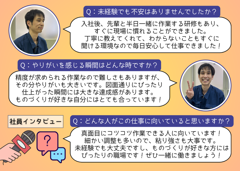求めている人材 Q:どんな人がこの仕事に向いていると思いますか? A:コツコツ作業できる、真面目な人が向いていると思います。細かい調整も多いので、粘り強さも大事です。 未経験でも大丈夫ですし、モノづくりが好きな方にはぴったりの職場です!ぜひ一緒に働きましょう! 【◎こんな方に!】 ◆コミュニケーションを大切にできる方! ◆精密作業や繊細な作業に興味がある方! ◆新しい技術やスキルを学び、成長したい方! ◆チームワークを大切にできる方! ◆安定した職場で長く働きたい方! \\未経験スタート大歓迎!// 高卒・第二新卒・社会人デビューも大歓迎! 実際に、未経験から入社して活躍している先輩もいます! 男女問わず幅広い世代が活躍中!もちろん経験者の方も大歓迎です!