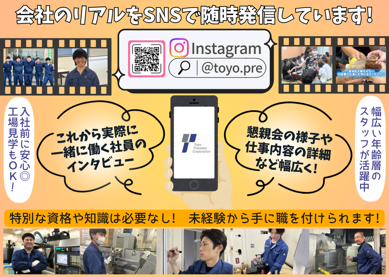 仕事内容 \\社員のリアルをSNSで公開中!// ◆インスタグラム:@toyo.pre◆ =========================== 会社情報・仕事の詳しい内容だけではなく、 社員インタビューや懇親会の様子など動画で発信中✨ 実際に一緒に働く人の素の表情が見られます♪ 全体の雰囲気などを事前に見てからの応募も歓迎! =========================== 高精度プレートを生み出す東洋プレシジョンで、【製造スタッフ】を募集! 「ものづくりに興味がある」 「業界未経験から手に職を付けたい」 「もっと雰囲気の良い会社で働きたい」 「今の職場の人間関係に悩んでいる…」 そんなあなたにピッタリな職場です✨ 実際に入社した社員からも、 「社内の雰囲気がよくて続けやすい!」という声が多数◎ 幅広い世代がのびのび働いている、温かい会社です✨ ⏰働く魅力ポイント! ✅有給が使いやすい職場!ワークライフバランス◎ 「推しのLIVE参戦♪」 「水曜にお休み入れて週の真ん中でリセット♪」 「3連休を作って旅行♪」など、 仕事とプライベートにメリハリをつけられる環境です✨ ✅充実の福利厚生&手当◎ 賞与4〜5ヶ月分支給!昇給も年1回! 頑張りをしっかり還元!高収入目指せる環境なのでモチベーション維持できます✨ ✅安心のサポート体制!業界未経験大歓迎◎ 特別な資格や知識は必要ありません! 入社後は新人研修とOJTを通じて、世界に誇れる精密加工技術をしっかり学べます✨ ✅若手スタッフも活躍中◎ 幅広い年齢層のスタッフが活躍中!長く安定して働ける環境が整っています✨ 20代:14名/30代:14名/40代:5名/50代:6名 ※パート・実習生含む ⏰仕事内容 精密金型製品の製造業務全般をお任せします! 半導体用・コネクタ用・モーターコア用などの金型プレートを、工作機械を使って加工作業し、検査、出荷まで行います。 繊細な作業や高精度な加工が求められるお仕事です! 【1日のスケジュール例】 ▼8:00 出社 ▼8:05 体操&掃除 ▼8:30 製品の研磨開始 ▼12:00 昼休憩 ▼13:00 中仕上げや後検定など最終確認 ▼15:30 焼き上がった製品の確認と砥石の準備 ▼17:00 終業&退社 未経験スタートの先輩も多いので、年齢問わず、安心して挑戦できる! わからないことも気軽に聞ける職場です♪ ⏰社員インタビュー 【▼新入社社員/Kさん】 Q:入社のきっかけは? A:地元・田川市で12年間、たばこのフィルター工場に勤めていました。 でも工場が閉鎖になり、県外への異動か退職かの選択を迫られました。 ちょうどその頃、娘が生まれて、出張や休日出勤の多い働き方を見直したくなったんです。 東洋プレシジョンは「休みがしっかり取れる」ことが魅力で、家庭と両立しながら働けると思い、入社を決めました。 Q:未経験でも不安はありませんでしたか? A:金型の製造は全くの未経験だったので、最初は不安もありました。 ですが、入社後には、先輩と半日一緒に作業する研修もあり、すぐに現場に慣れることができました。 先輩たちがとても丁寧に教えてくれて、わからないこともすぐに聞ける環境なので毎日安心でした! 作業中も気軽に声をかけながらコミュニケーションが取れるので、3ヶ月でしっかり馴染むことができました! Q:現在の仕事内容と、やりがいを感じる瞬間について教えてください。 A:現在は「研磨」を担当しており、図面通りにプレートを削っていく工程を行っています。 精度が求められる作業なので難しさもありますが、その分やりがいも大きいです。 1日に4〜5枚ほど仕上げますが、図面通りにぴったり仕上がった瞬間には大きな達成感があります。 細かな調整がうまくいったときは特に嬉しく、元々ものづくりが好きな自分にはとても合っている仕事だと感じています。 Q:逆に、大変なことは? A:今はまだ入社3ヶ月で大きな大変さはないですが、忙しい時期は業務が増えて大変になると聞いています。 でも、それだけ仕事があるのはありがたいことだと思います。 Q:職場の雰囲気はどうですか? A:作業中はみんな集中していますが、休憩時間は楽しく会話もし、和気あいあいとしています。 オン・オフの切り替えがしっかりしていて働きやすい職場です! Q:今後の目標は? A:まずは、自分が扱っている機械を完璧に操作できるようになることです。 最近は成功体験が増えてきて、もっと上達したいという気持ちが強くなっています!