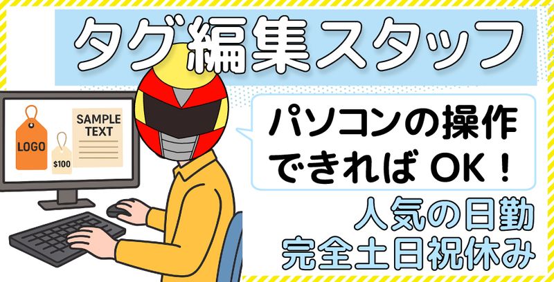 仕事の内容 【完全土日祝休み×冷暖房完備!】 \未経験OK★アパレルタグなどの編集スタッフ募集♪/ ≪お仕事内容≫ アパレル商品のタグや値札に印字する文字レイアウトの編集を行うお仕事です。 メーカーから届いたデータをもとに、フォント調整や微修正を行って仕上げます。 使用ソフト ・Adobe Illustrator 他、専用ソフト(Adobe Illustratorと類似) ★デザインの経験は問いません!★ デザイン未経験からでも安心して始められます! Adobe Illustratorが使えなくてもOK! ていねいにレクチャーしますのでご安心下さい(*'▽') ・勤務時間:9:00~18:00(実働8時間/休憩60分) ・休日:完全土日祝休み(年間休日120日以上) ・長期休暇:年末年始・GW・お盆あり ・残業:あり(繁忙期3〜5月、9〜11月頃は日に1.5時間程度) ※繁忙期残業が出来る方を募集! ≪時給≫ 1,150~1,250円(経験・スキルにより決定) ≪こんな方にぴったり≫ ・コツコツとした作業が得意な方 ・IllustratorやInDesignの操作経験を活かしたい方 ・未経験からデザインに関わる仕事を始めたい方 ・家庭やプライベートと両立して働きたい方 ≪職場の雰囲気≫ 冷暖房完備の快適なオフィス環境! 子育て世代も多く、お子さんの急な用事などにも柔軟に対応できる職場です。 服装や髪型も自由で、のびのびと働けます(^^)/ ≪待遇・福利厚生≫ ・社会保険完備 ・無料駐車場あり ・冷暖房完備 ・服装自由(上着・ポロシャツ貸与、ズボンはジーンズでもOK) ・食堂あり ・週1回パンの移動販売あり ・受動喫煙対策あり(屋内禁煙) ≪ひとこと≫ 完全土日祝休みでプライベートも充実! 冷暖房完備の快適な環境で、長く安定して働けます。 ★本求人にご興味をお持ちの方は、応募する!より必須項目記載の上、 お問合せ下さい。 (お電話でのお問合わせ先:0120-67-3244 ※平日9時00分~18時00分)