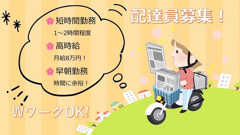 仕事内容 信毎ふれあいネットにて 新聞配達スタッフ大募集! 早朝の短時間でサクッと働けるお仕事です。 ・月給8万円~(2時間の場合) ・未経験者OK ・早朝のみの短時間勤務(1~2時間程度) ・早起きが得意な方 ・空いた時間を有効活用したい方 ・嬉しい高時給 ・Wワークに最適 〇仕事内容 朝刊の配達業務です。 朝4:00頃から1時間~2時間のお仕事です。 コースによって時間や部数は変動しますが、 大体80部~180部前後を担当していただきます。 原付バイクを使用して配達を行います。 収入は配達コースによって多少変動します。 配達前に配達事前準備(チラシ封入)のお仕事も ありますので、より収入が欲しい方は是非 ご検討ください。 〇おススメポイント 難しいお仕事ではありませんので初心者や 未経験の方でも安心して始められます。 配達ルートは毎回同じなので、覚えてしまえば スムーズにお仕事を進められます。 早朝1時間~2時間程度の短時間勤務なので 空いた時間でしっかり稼げます。 Wワークもしやすい勤務時間帯です。 普通運転免許又は原付免許をお持ちであれば、 新聞配達の経験がなくても大丈夫です。 〇通勤について 勤務地は茅野市本町西になります。 茅野市にお住まいの方はもちろん、 諏訪市や岡谷市、下諏訪町、上諏訪町、原村、 富士見町などからも通勤可能です。 〇応募について 経験・年齢問わず活躍できるお仕事です。 新しいお仕事をお探しの方はぜひご検討ください。 ご不明な点等お気軽にご連絡ください。 お問い合わせだけでも大歓迎です。 ご応募お待ちしています。