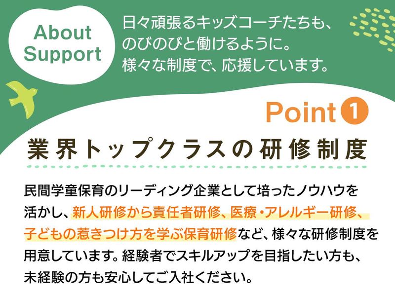 仕事内容 ✨この求人のアピールポイント  ̄ ̄ ̄ ̄ ̄ ̄ ̄ ̄ ̄ ̄ ̄ ̄ ̄ ̄ ̄ ̄ ̄ ̄ ̄ ̄ ✔ 未経験&無資格OK・20代~30代を中心に活躍中◎ ✔ 年間休日120日+各休暇制度&充実の福利厚生 東急グループならではの安心感と働きやすさ◎ ✔ 子育て支援制度&育休取得率も100%! 子育てとの両立を会社がサポート! ✔ 研修制度が充実!未経験から活躍できる◎ 自分らしいキャリアを描いて働く! ✔ 5年連続「働きがいのある会社」 ベストカンパニー選出! 東急グループの一員として、子育て支援事業を展開する当社。 学校でも家庭でもない「子どものサードプレイス」をコンセプトに、学童保育・児童館を79施設、保育園5園を運営しています。 今後の事業拡大に向け、キッズコーチ(学童保育スタッフ)を増員募集! わたしたちと一緒に、子どもの成長をサポートしていきませんか。 ※2026年7月入社まで可 ✨仕事内容  ̄ ̄ ̄ ̄ ̄ ̄ ̄ ̄ ̄ ̄ ̄ ̄ ̄ ̄ ̄ ̄ ̄ ̄ ̄ ̄ 学童保育・児童館でキッズコーチとして、一人ひとりの個性や可能性を引き出す「コーチング」で子どもたちの成長をサポート。 放課後と長期休みを価値ある時間にするために、日常プログラムはもちろん、学校や家庭では経験できないイベントプログラムを通して子どもたちの「社会につながる人間力」を育んでいます。 また、学校での出来事を聞いたり、一緒にイベントを楽しんだり、時には保護者や先生にも言えないような相談にのることも。 キッズコーチは子どもの心の拠り所となる存在です。 >>具体的には ・生活全般の保育業務 ・イベントプログラムの企画や運営 ・保護者とのコミュニケーション ・上記に関連する事務業務 ✨1日の流れ(公設民営型学童保育の例)  ̄ ̄ ̄ ̄ ̄ ̄ ̄ ̄ ̄ ̄ ̄ ̄ ̄ ̄ ̄ ̄ ̄ ̄ ̄ ̄ 10:00 出社・子どもたちを迎える準備 12:00 ミーティング 14:30 子どもたちを出迎え 16:30 外遊び、おやつの提供 18:00 子どもたちのお見送り 18:30 翌日の準備 19:00 退社 ✨1日の流れ(キッズベースキャンプ店舗の例)  ̄ ̄ ̄ ̄ ̄ ̄ ̄ ̄ ̄ ̄ ̄ ̄ ̄ ̄ ̄ ̄ ̄ ̄ ̄ ̄ 12:00 出社・子どもたちを迎える準備 13:00 ミーティング 14:30 子どもたちを出迎え 16:30 外遊び、おやつの提供 18:00 子どもたちのお見送り 19:30 翌日の準備 21:00 退社 ✨充実した研修制度  ̄ ̄ ̄ ̄ ̄ ̄ ̄ ̄ ̄ ̄ ̄ ̄ ̄ ̄ ̄ ̄ ̄ ̄ ̄ ̄ 民間学童保育のリーディング企業として培ったノウハウを活かし、「子どものほめ方」「コーチング」など具体的な保育研修から、医療・アレルギーやビジネスマナーなど専門知識を学ぶものまで多彩な研修プログラムを用意しています。 大学で教員免許を取得したけれど、この業界は未経験という方も、経験者でスキルアップを目指したい方も安心して入社いただけます。 研修の一例 ◎新人研修(保育基礎/リスクマネジメント/コーチング/学童保育基礎知識) ◎階層別研修(リーダー候補/責任者/エリアマネージャー/2,3年目研修) ◎保育研修(コーチング/ひきつけ方/ほめ方/けんかの仲裁) ◎専門分野研修(医療/アレルギー/上級救命) ✨資格取得支援&充実の福利厚生  ̄ ̄ ̄ ̄ ̄ ̄ ̄ ̄ ̄ ̄ ̄ ̄ ̄ ̄ ̄ ̄ ̄ ̄ ̄ ̄ ✔ 資格取得サポート(保育士や放課後児童支援員など) ✔ 医療費補助(通院時一定額以上に対し支給) ✔ 東急グループ施設割引(宿泊施設等の利用補助) ✔ 各種お祝い金:結婚や出産、入学祝い金等 ✔ 東急グループ保険加入 ✔ 引越支援一時金(10万円) ✔ 子育て支援制度 ・産前産後休暇 ・育児休業(現在、育休取得率100%) ・お子さんが小学校3年生までの時短勤務 ・KBCほいくえん/キッズベースキャンプ優先利用&割引 ・家族看護休暇 ✔ Wワーク制度(スキルアップサポート) ✔ 退職金制度 ✨勤務地について  ̄ ̄ ̄ ̄ ̄ ̄ ̄ ̄ ̄ ̄ ̄ ̄ ̄ ̄ ̄ ̄ ̄ ̄ ̄ ̄ キッズベースキャンプα二子玉川 キッズベースキャンプ三軒茶屋 キッズベースキャンプα用賀 キッズベースキャンプ武蔵小杉東急スクエア など 上記以外にも、新宿区(新宿・高田馬場・早稲田など)の公設民営型の学童保育でも募集中♪ 面接時、お住まいの最寄り駅と最新の募集状況をもとに入社時の勤務場所を確認させていただきます。 ✨社員インタビュー  ̄ ̄ ̄ ̄ ̄ ̄ ̄ ̄ ̄ ̄ ̄ ̄ ̄ ̄ ̄ ̄ ̄ ̄ ̄ ̄ Aさん(28歳・入社3年目) 「未経験からのスタートでしたが、先輩たちのサポートのおかげで安心して仕事を始めることができました。 子どもたちとのふれあいを通じて、自分自身も成長していると感じています。毎日が新しい発見の連続で、とてもやりがいを感じています。」 Bさん(31歳・入社5年目) 「元々は銀行員でしたが、子どもたちと関わる仕事がしたいと思い、転職を決意しました。 今では、転職して良かったと感じています。キッズベースキャンプでは、子どもたちの成長をサポートすることで、自分自身も豊かな経験を積むことができます。」