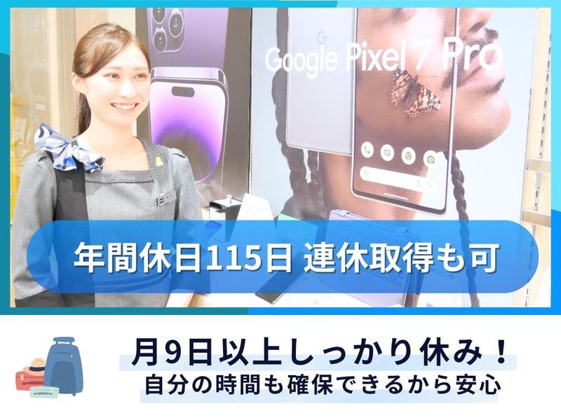 仕事内容 ━━━━━━━━━━━━ 「接客が好き」を強みに 「スマホ好き」を武器に 自分らしく輝ける場所✨ ━━━━━━━━━━━━ ✅最新スマホや新サービスにイチ早く触れる ✅年4回の賞与で頑張りを即還元! ✅20代で店長昇格の実績が多数あり! ✅転勤なし!地元で長く働ける環境! 「スマホの新機種が出ると ついワクワクしてしまう」 「便利なアプリを見つけると誰かに教えたくなる」 そんなあなたの好奇心が、ここでは最大の武器になります✨ 飲食店や販売のお仕事でお客様を笑顔にしてきたあなた。 その「おもてなしの心」に「最新の知識」をプラスして、 モバイルコンサルタントとして新しい一歩を踏み出しませんか? 【 お任せするお仕事 】 ・スマホ/携帯電話のご案内・販売 ・機種やプランのご提案 ・契約や機種変更時のサポート ・アクセサリ類の販売 ・光回線や各種サービスのご紹介 ・操作方法のサポート まずは明るい挨拶から✨ 知識は後からじっくり身につけていけばOKです! 【 好きを仕事にする喜びを 】 ◆知識は後からついてきます 最初は誰だって未経験!最新スマホやプランの知識は、研修や先輩とのOJTでゆっくり覚えていけば大丈夫です。 ◆経験を高く評価します 「お客様の気持ちに寄り添う」そのスキルがあるあなたなら、知識さえ身につければすぐに店舗の主役になれます! ◆頑張りはダイレクトに還元 年4回のボーナスに加え、最大8万円の資格手当も!「好き」を極めるほど給与もステップアップします✨ 【 働きやすさを支える充実の制度 】 仕事も大切だけど、自分の人生はもっと大切。 だから、当社は休みやすさに本気で取り組んでいます✨ ✅連休取得を積極的に推進 一般スタッフからエリア責任者まで誰もがしっかり休める環境です! 希望休は「月4回」まで取得可能◎ ✅育児支援制度も万全 産休・育休の取得はもちろん、復職後は時短勤務の相談もOK! 「出産復職支援金20万円」で家計もしっかりサポートします◎ ✅ブランクがあっても安心 復職前には「個別研修」を実施! 最新機種やサービスの変化も丁寧にフォローするので安心して現場に戻ってこられます♪