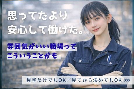 仕事内容 「立ちっぱなしで重い作業はちょっと不安…」 「でもフルタイムで安定して働きたい」 そんな方に選ばれている軽作業のお仕事です。 扱うのは手のひらサイズの小さめ部品。 空調完備の職場で、落ち着いてコツコツ進める作業です。 実際に働くスタッフからも 「思っていたより体力的にラクでした」 という声が多い職場です。 ● point *月収23万円以上可能 *日勤のみ(8:30~17:15) *空調完備で一年中快適 *重いものなしの軽作業 *残業は月10時間程度と少なめ *車通勤OK(無料駐車場完備) *女性スタッフ多数活躍中 久しぶりの仕事復帰の方も多く働いています。 ■ 勤務時間 ■ 8:30~17:15の日勤のみ。 朝は少し余裕を持って出勤でき、 生活リズムも整えやすい時間帯です。 夕方には終わるため、 家事やプライベートの時間も確保しやすい働き方です。 ■ 仕事内容 ■ 工場で使われる機械の内部に入る 小さなパーツを取り付ける軽作業です。 作業はとてもシンプル。 1)手のひらサイズの部品を準備 2)決まった位置にセット 3)工具で軽く固定して完了 基本はこの繰り返しです。 重たいものを持ち上げる作業はなく、 手順どおりに進めるシンプル作業です。 難しい作業はないため、 製造未経験の方も安心して始められます。 ■ 未経験でも安心 ■ 入社後は作業手順の説明からスタート。 ・図を見ながらゆっくり練習 ・先輩スタッフが横でサポート ・慣れてから一人作業へ 焦らず覚えていける環境です。 工場勤務が初めてだったスタッフも 多数活躍しています。 ■ 職場環境 ■ ・空調完備で夏も冬も快適 ・清潔感のある作業場 ・落ち着いた雰囲気の職場 「工場=キツい」というイメージを 良い意味で覆す環境です。 ■ 社員の声 ■ ▼ 20代女性(元販売) 工場の仕事は初めてでしたが、作業がシンプルで覚えやすかったです。 空調も効いていて、想像していたより働きやすい職場でした。 ▼ 30代女性(元事務) 立ち仕事でも重い作業がないので体力的に安心です。 日勤のみなので生活リズムも安定しています。 ■ 働き方 ■ ・日勤のみ(8:30~17:15) ・残業は月10時間程度 ・月収23万円以上可能 安定したフルタイム勤務で、 無理なく続けやすい働き方です。 ■ こんな方に向いています ■ ・軽作業の仕事を探している ・安定したフルタイムで働きたい ・体力的に無理のない仕事がいい ・空調のある職場で働きたい ・コツコツ作業が得意 未経験からでも安心して始められます。 ■ 応募について ■ 未経験歓迎・資格不要。 見学からのスタートもOKです。 「少し気になる」 その段階での応募も大歓迎。 落ち着いて働ける軽作業のお仕事を、 ここから始めてみませんか。 業務の変更範囲:「会社の定める業務」