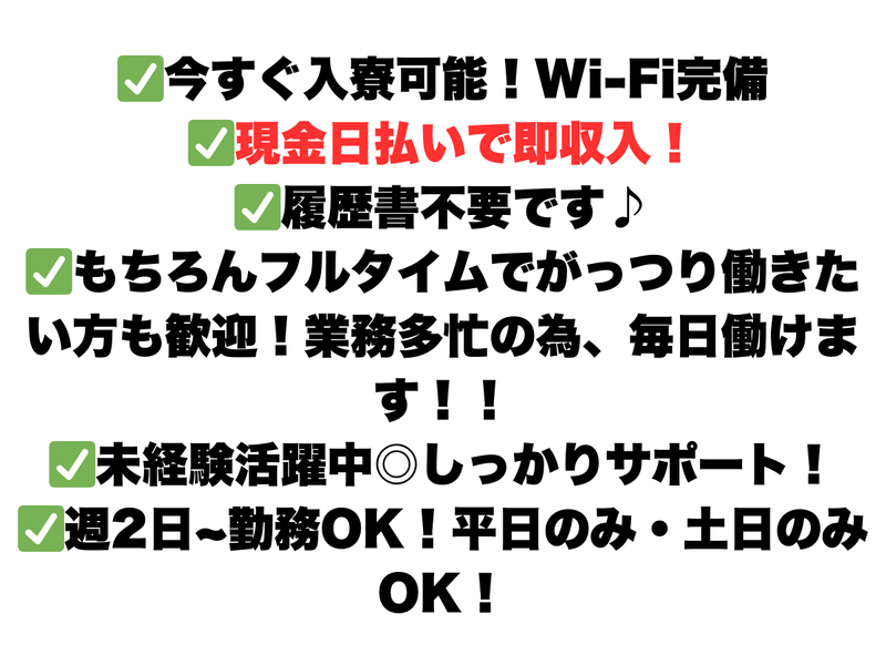 週2日~日払い◎10代男性活躍中◎Wi-fi完備寮即日入寮可