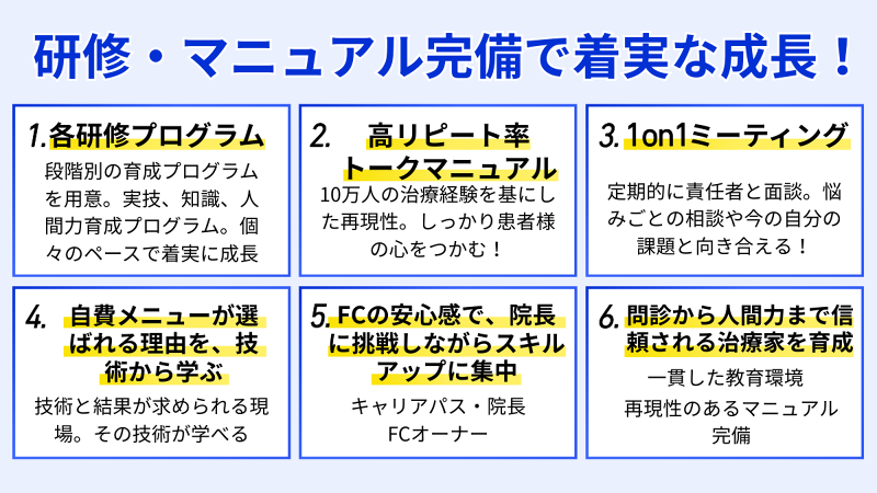 アピールポイント: 当院の3つの特徴 1:症状改善のための技術習得をサポートします! 当院の一人一人の症状に合わせた根本原因改善治療法の技術を、 社内研修・マニュアルに落とし込んでおり、 患者様を症状改善に導くための、技術を習得できるよう、 バッチリサポートいたします♪ 【当院の施術の特徴】 ・一人一人の症状に合わせた的確なアプローチで 症状を根本治療へと導くオーダーメイド施術! ・機能解剖学に基づいた検査と丁寧な問診で根本原因を探り出し、早期回復へ導く ・ プロアスリートにも対応できる高い技術力と最新で高度な技術を提供 ・時間をかけた分かりやすい説明と問診で痛みを繰り返さない生活習慣の指導 2:一人一人にあったやりがい・理想の未来を一緒に考えます! 当院では、一人ひとりがやりがいを持って働けるようサポートしています♪ 「理想の働き方」は人それぞれ違います。 ◎マニュアル完備で技術面の不安を排除! ◎有休消化率100% ◎治療に集中できるようオープン準備(清掃・カルテ出し)などは、 専任のパートさんが担当 自分自身も大切にしながら、治療に専念できる環境です♪ 3:研修・教育制度充実!院独自の教育ツールで、着実なスキルアップ! ◎保険・自費診療別のトークスクリプトを用意 ◎目の前の患者さんに集中できる環境 ◎1つの技術を約2ヶ月程度で取得していく、着実なステップアップシステム ◎教育担当と毎月1on1定期面談を実施!一人一人の将来像に合わせたサポート制度 ◎知識や技術に不安を抱えている方も安心★ 第二新卒・中途の方も、新卒入社と同様の丁寧な研修 プロの治療家として、着実にキャリアアップできる環境が整っています! 【当院の想い】 【 笑顔の輪が繋がる本当の治療を提供できる環境 】 本当に患者さんのためになっているのかな? 「根本治療に繋がっていない」と思いながらも、 気づけば流れ作業のような、根本治療に繋がらない治療をしていませんか? 当院は、患者様の健康的な身体作りと未来を守るために、 一人一人の症状に合わせて『 痛み 』の本当の原因を探り出し、 根本から改善する治療を提供しています。 治療技術だけでは本当の信頼は生まれません。 気配り・心配り・説明力・人間力など 患者様に安心して心身を任せてもらう為、技術力以外の面も必要になってきます。 患者様が安心して身体を任せられる「治療家」として成長できる環境があります。 そして、あなたの成長が人を笑顔に導き仕事のやりがいをもたらす。 「先生が居てくれてよかった」と心からの感謝を多くの方に言っていただけるように、 共に成長し、患者様の笑顔の輪を広げていきましょう! 【いとう鍼灸院・整骨院で実現する理想の治療家人生】 ◎症状の根本改善を実現することで、心からの感謝をいただける ◎症状改善後の患者さんの人生を丸ごと支える充実感 ◎日々技術力向上、時代に合わせた最新技術や知識の習得 ◎自信満々で患者様の施術を担当 ◎治療家としての成長だけでなく、人としての成長や理想の人生を歩むための人生設計 ◎様々な視点から治療を行うことができ、どんな症状にも対応できる知識と技術力! 上記のように、人生を楽しみながら働いてるメンバーがたくさんいます。 今、貴方が抱えているお悩みを当院では、必ず解決することができます。 このような環境に少しでもご興味をお持ちいただけましたら、 まずは院内見学もしくは面接・面談からお待ちしております!