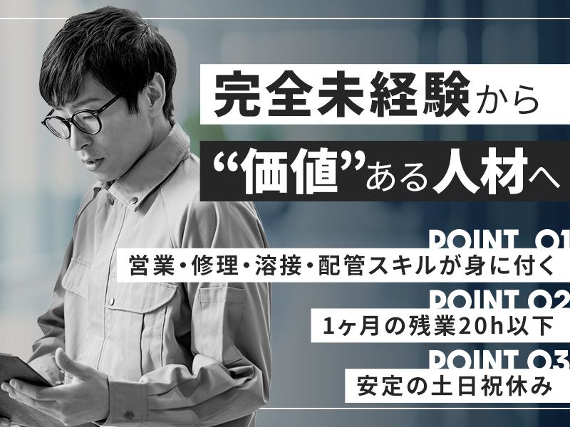 【未経験OK】残業月20h以内×土日祝休み!営業・配管・機械修理・溶接など、幅広い経験が身に付く!/完全未経験でもOK/採用残りわずか!