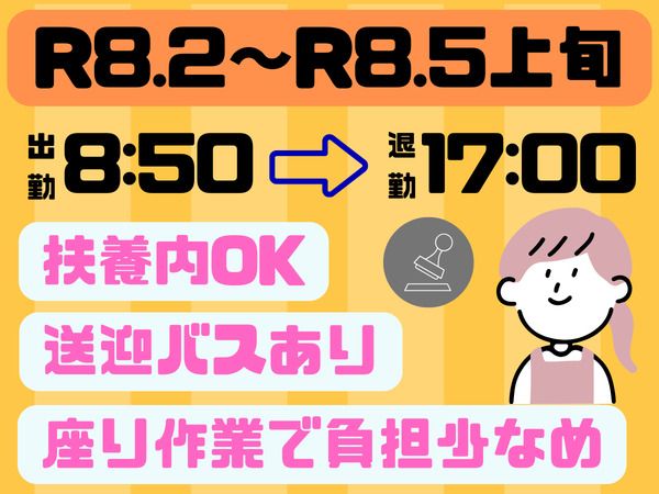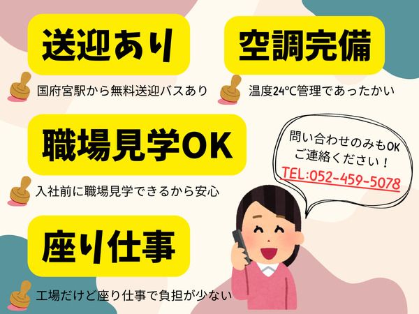 ⭐ノーメイクでもOK⭐髪色自由⭐国府宮駅から送迎あり!空調完備!◎扶養内OK◎8:50出勤/17:00退勤◎車通勤可◎交通費支給◎土日祝休み