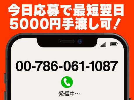 選考プロセス 電話応募で、その場で研修日時のご予約ができます。 あっという間にお仕事決定♪ ▼ご応募はこちらから▼ 【00-786-061-1087】 【問合せ先について】 問合せ先:0078-6061-1087 <TEL受付時間>平日9:00~17:00、それ以外の時間帯はWEBにて24時間受付中! 応募方法 ▼ご応募はこちらから▼ 【00-786-061-1087】 面接なし!来社なし!電話1本で完結! 簡単な確認のみで即内定! 自宅にいながら内定GET&履歴書不要!