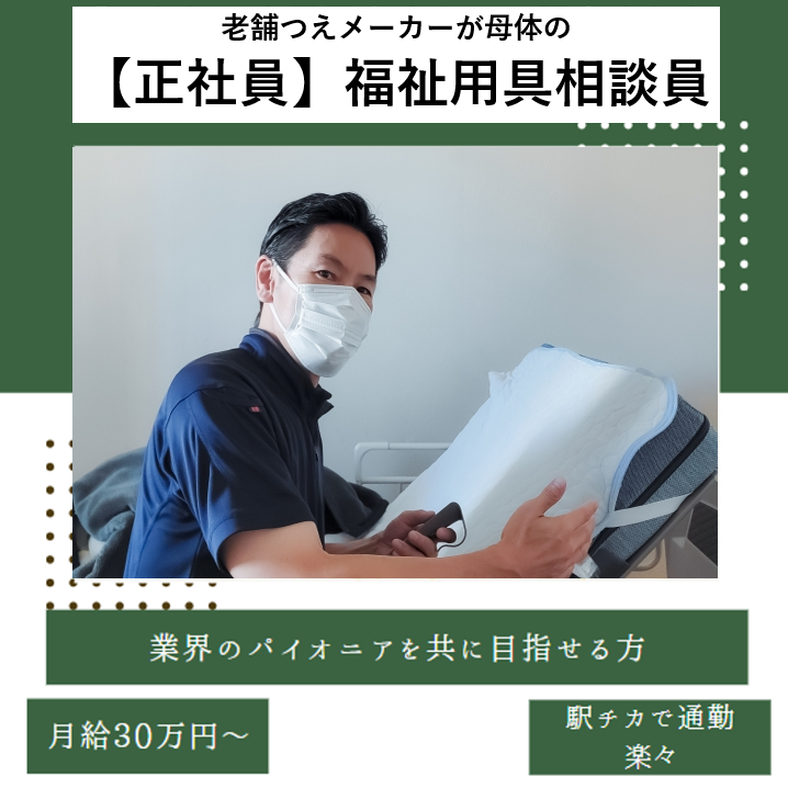 仕事内容 \\この求人のポイント// ✅日々お客様から感謝されるお仕事♪ ✅母体は老舗つえメーカーで安定成長中 ✅未経験でも月給30万円~ ✅全国有名百貨店に出張あり◎ ✅メディアや万博で大注目の企業♪ ◤ 社会貢献×プロフェッショナル ◢  ̄ ̄ ̄ ̄ ̄ ̄ ̄ ̄ ̄ ̄ ̄ ̄ ̄ ̄ ̄ ̄ ̄ ̄ ̄ ̄ 高齢化が進む今の日本では、 施設や自宅での介護環境をよくすることが 求められています。 介護を必要とするご高齢の方や そのご家族にとってベストな福祉用具を プロフェッショナルとしてご提案し、 今の生活をさらによくするお手伝いを するのが我々のお仕事です。 「ベッドを変えてから、寝起きが快適になった!」 「車いすを買ってから、よく外に出るようになった!」 「手すりを付けてから、家の中の移動が楽になった!」 たった一つの提案で、 利用者が日々喜びを感じていただけます。 入社後に専門的な知識は全て研修しますので 介護・福祉に関する経験や知識は一切不問です。 今後、福祉用品相談員の需要が高まることが 予想されます。 高い専門性を持つプロとしてのキャリアと、 人々の暮らしを支えるやりがいを両立しませんか? ▍お仕事について  ̄ ̄ ̄ ̄ ̄ ̄ ̄ ̄ ̄ ̄ ̄ ̄ ̄ ̄ ̄ ̄ ̄ ̄ ̄ ̄ 協力会社、ケアマネさんからご紹介いただき 在宅で介護が必要な高齢者の方と そのご家族に向けたご提案を実施します。 <提案内容> ✅福祉用具の販売・レンタル └介護ベッド、車いす、歩行器、杖など ✅バリアフリーリフォーム └住宅各所へ手すりやスロープの設置など 《担当していただくエリア》 京都市内 ▍1日の流れについて  ̄ ̄ ̄ ̄ ̄ ̄ ̄ ̄ ̄ ̄ ̄ ̄ ̄ ̄ ̄ ̄ ̄ ̄ ̄ ̄ 出社 ↓ 朝礼と当日スケジュールの確認 ↓ 事務作業(メールチェックなど) ↓ 利用者さんやケアマネさんを数件ご訪問 └ニーズのヒアリング、提案や点検業務 (適宜お昼休憩1時間含む) ↓ 帰社後 事務作業 ↓ 終業 ▍当社について  ̄ ̄ ̄ ̄ ̄ ̄ ̄ ̄ ̄ ̄ ̄ ̄ ̄ ̄ ̄ ̄ ̄ ̄ ̄ ̄ 「つえ屋」は、杖・ステッキ専門店です。 京都市内をはじめ東京・大阪にも店舗を 展開しています。 「月曜から夜ふかし」 「がっちりマンデー!!」など 様々なメディアに多く取り上げていただき 現在では年商3億円を超え、業績は絶好調。 1日200万の売上を超えることも。 スタンダードな木製ステッキから デザイン性に富んだ高級ステッキ、 折りたたみなど実用性に富んだ歩行補助具、 デザインにこだわったおしゃれな製品まで どんなお客様にも対応できるように 質はもちろん、常時在庫は20万本と 豊富な商品を取り揃えています。 社長自身が目を悪くしていることもあり 『お客様が本当に喜ぶつえを届けたい』 この思いの為に全メンバーが一丸となって 商品を開発・販売しております。 こんな、つえのスペシャリスト集団が 福祉業界に参入していくための 初期立ち上げメンバーの募集です。