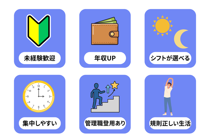 勤務時間詳細 実働時間:1日あたり8時間 平均勤務日数:1ヶ月あたり16日 〜 22日 8:00~17:00、20:00~5:00(休憩1h) 予定に合わせて働ける柔軟シフト! 残業ほぼなし&直行直帰OKだから、 「無理せずしっかり稼ぎたい」方にピッタリ。 週4日~勤務で私生活も充実できます。