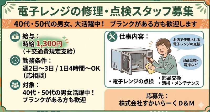 仕事内容 \安心・安定のすかいらーくグループ/ ✅未経験OK!難しい作業なし! ✅週3~4日、1日4時間程度の勤務 ✅扶養内勤務OK! ✅グループ共通【25%割引】特典あり ✅車・バイク通勤OK(ガソリン代支給) ==================== 【仕事内容】 機械の簡単な清掃と部品交換・軽作業のお仕事! <具体的には> ■修理・点検 ・清掃、部品交換(ビス外しなど) ・荷受け/出荷作業あり ※マニュアル完備&社員が近くにいて安心! ■軽作業・事務 ・倉庫内清掃 ・荷受け、発送準備 ・簡単なExcel入力 (住所・日付など数字入力のみ) 最初は清掃や荷受けなど 本当に簡単な作業からスタートします! 【入社後の流れ(研修体制)】 ・1ヶ月目:倉庫清掃/荷受け/出荷 ・2ヶ月目:機器の清掃 ・3ヶ月目~:部品の交換 段階的に覚えられるので、未経験でも安心です! <こんな方におすすめ> ⏩DIY・モノづくり・修理に興味がある ⏩ドライバーを触ったことがある ⏩コツコツ作業が好き ⏩社員は30代~50代の方在籍中 ⏩男性スタッフ多数在籍中!