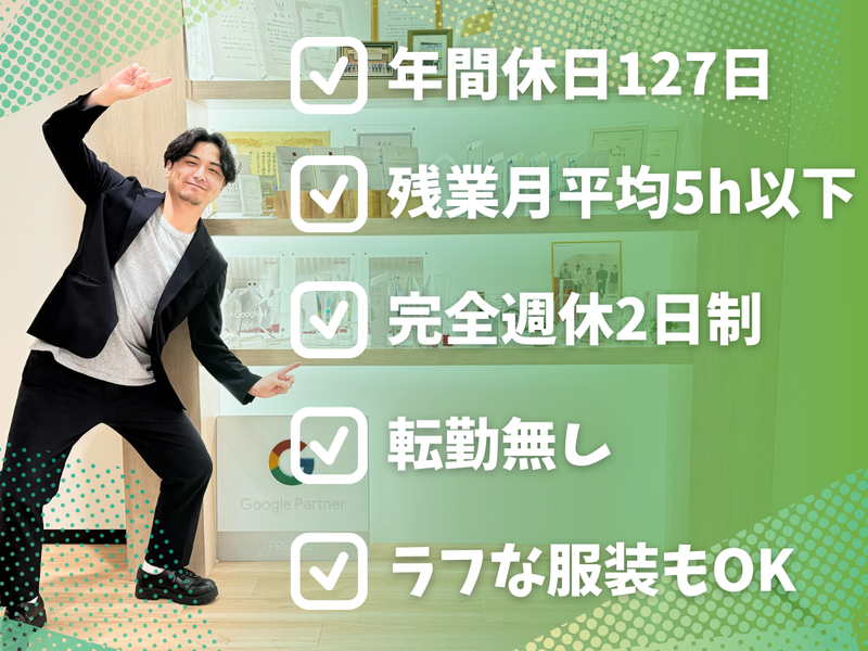 仕事内容 \当社は働き方改革を推進し、多くの賞を受賞している会社です/ ◆ホワイト企業特別賞 ◆2024年 健康経営優良法人認定 ◆Google Premier Partner Awards 最優秀賞(優れた職場環境部門)などライフステージが変わっても、安心して長く働ける環境です。 ▼ そんな当社で働くPOINTをご紹介! ▼ □―――――――――― ・年間休日127日 ・残業月10h以下 ・完全週休2日制×土日祝休み ・残業代は100%支給 ・デュアルディスプレイ ・オフィスグリコあり ・服装自由&副業OK ――――――――――□ 「世界一効率的な企業になる」という 経営ビジョンのもと、残業は最小限まで減らすなど、【働き方改革】を推進! 前年業績を120%という急成長を見せつつ、 2021年以降は<社員定着率94%>を実現! 具体的な仕事内容 ============== ■ヒアリング(完全反響スタイル) HPや紹介を通じてお問い合わせのあったお客様へアプローチします。 こちらからの強引な勧誘は一切行いません。 ■提案資料の作成 PowerPointやExcelを使用し、 お客様の課題に合わせたシミュレーションや提案資料を作成します。 ■ご提案・商談 訪問、またはWeb会議・電話・メール等でプランを提示します。 全国の多種多様な業種のお客様が対象となるため、幅広いビジネス知識が身につきます。 ■顧客フォロー 受注後は社内の運用担当者と連携し、運用開始後のフォローアップを行います。 ============== 実際に、業界未経験からスタートし、 わずか数年でマネージャーとして活躍する社員も在籍しています。 当社には年功序列の概念がなく、成果と意欲を正当に評価するため、スピーディーな昇格が可能です。 「市場価値の高いWeb広告の知識」と、組織を牽引する「マネジメント経験」。 その両方を最短距離で手に入れたい方にとって、 ここは最高のステージです! ■弊社で働くPOINT ★売るのではなく繁栄をお手伝いする Web広告の営業というと、「テレアポ飛び込 みで必死に案件を獲得し、厳しいノルマを追 う」というイメージがあるかもしれません。 しかし、当社の営業部は違います。私たち 自身がWeb広告運用のプロとして自社集客 を行っているため、営業スタイルは「100% 反響型」です。本当に広告を必要としている お客様からのお問い合わせに対し、最適なプ ランをご提案することに集中できます。 ★「お断りする」のも、誠実さの証 お客様のビジネス繁栄を第一に考えるため、 個人ノルマは一切ありません。ヒアリング の結果、費用対効果が見合わないと判断し た場合は、正直に「やらないほうがいい」 とお伝えし、お断りすることもあります。 無理な受注をせず、お客様と対等な立場で 本質的な課題解決に向き合える環境です。 ★世界一効率的な企業を目指して 目指しているのは、クレバーで少数精鋭な組 織。チームで提案書の構成や説明方法を共有 工夫し、徹底的に無駄を省いています。 その結果、月の平均残業時間は5時間未満を 実現しました。プライベートも充実させて いる社員が多く在籍しております。