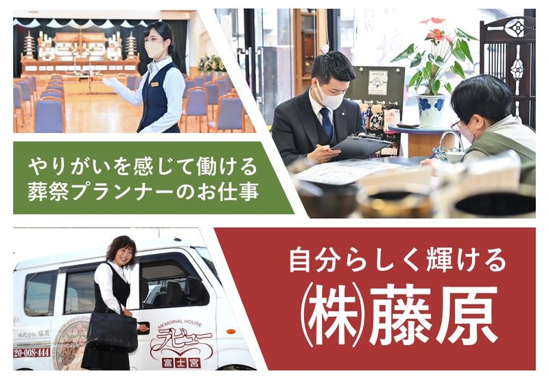 概要 葬祭プランナー 募集職種 営業(個人) 雇用形態 正社員 勤務先店舗・オフィス 株式会社藤原 募集内容 この求人のポイント プライベートも大切にできる◎ \応募の前に不安を解消/ ■スキルや資格がなくても大丈夫? 未経験OK!異業種からの転職者も多数 丁寧な研修ありで基本マナーから学べます ■年収はどれくらい? 入社1年目で年収400万円が可能です 月給21万円~+各種手当が充実! ■お休みは取りやすい? 週休2日制(月8~9日)です 勤続1年以上で5連休のリフレッシュ休暇も! ■給料はちゃんと上がる? 年1回の昇給+年2回の賞与あり あなたの頑張りをしっかり還元します 【勤務地】 ※勤務候補先は以下の通りです ※状況によりますが、お住まいを考慮いたします <富士・富士宮エリア> ■駅南ホールきずな ■若の宮ホールあかり ■f.ファミリエまんの ■ラビュー富士たかおか ■ラビュー新富士 <沼津・三島エリア> ■f.ファミリエ きせがわ ■ラビュー沼津 ■ラビュー沼津千本 ■ラビュー三島北 業種・業界 専門サービス 必須スキル・経験・資格 【いま求人を見ているあなた】 「新しい仕事に挑戦したい」 「接客など人と話すことが好き」 「礼儀正しいと人に言われたことがある」 など前向きに取り組めるあなたの応募をお待ちしています! 必須条件: ■要普通免許(AT 限定可) ※車通勤が必須となります 異業種からの転職歓迎! 採用担当者の連絡先 manage@loveyou-toubu.co.jp 受動喫煙防止措置条項 受動喫煙対策 :敷地内禁煙(詳細は面接時にお尋ねください)